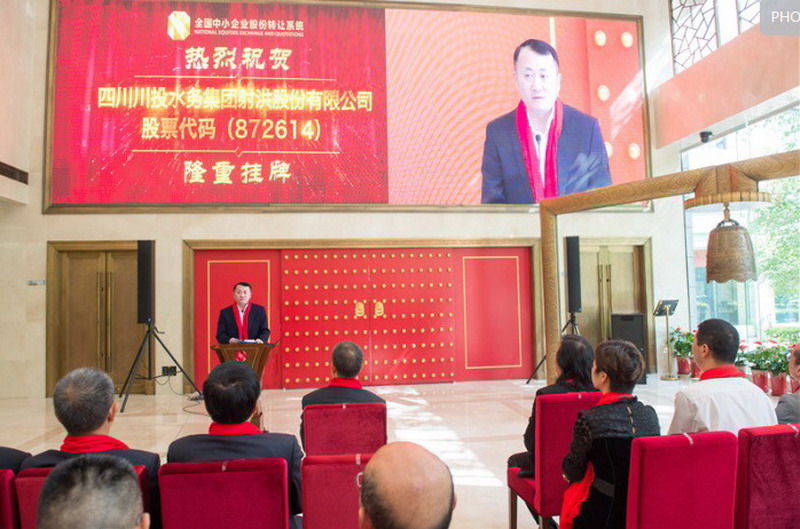 2018年5月8日,川投集團(tuán)旗下的四川川投水務(wù)集團(tuán)射洪股份有限公司在北京市全國中小企業(yè)股份轉(zhuǎn)讓系統(tǒng)公司舉行正式掛牌儀式。省國資委黨委委員、副主任宣迅,川投集團(tuán)董事、副總經(jīng)理李洪,射洪縣委書記蒲從雙,川投水務(wù)集團(tuán)董事長梁有國、總經(jīng)理鄧銳以及省國資委產(chǎn)權(quán)監(jiān)管處、企業(yè)改革處、辦公室,射洪縣委、縣政府相關(guān)負(fù)責(zé)人等參加了掛牌敲鐘儀式。省國資委副主任宣迅、射洪縣委書記蒲從雙分別致辭,對川投水務(wù)射洪公司成功掛牌新三板表示祝賀,希望繼續(xù)做好民生服務(wù)和保障工作,進(jìn)一步深化改革,加快國企優(yōu)質(zhì)資源整合,壯大國有資本上市規(guī)模。川投集團(tuán)董事長代表川投水務(wù)射洪公司敲響了開市寶鐘。