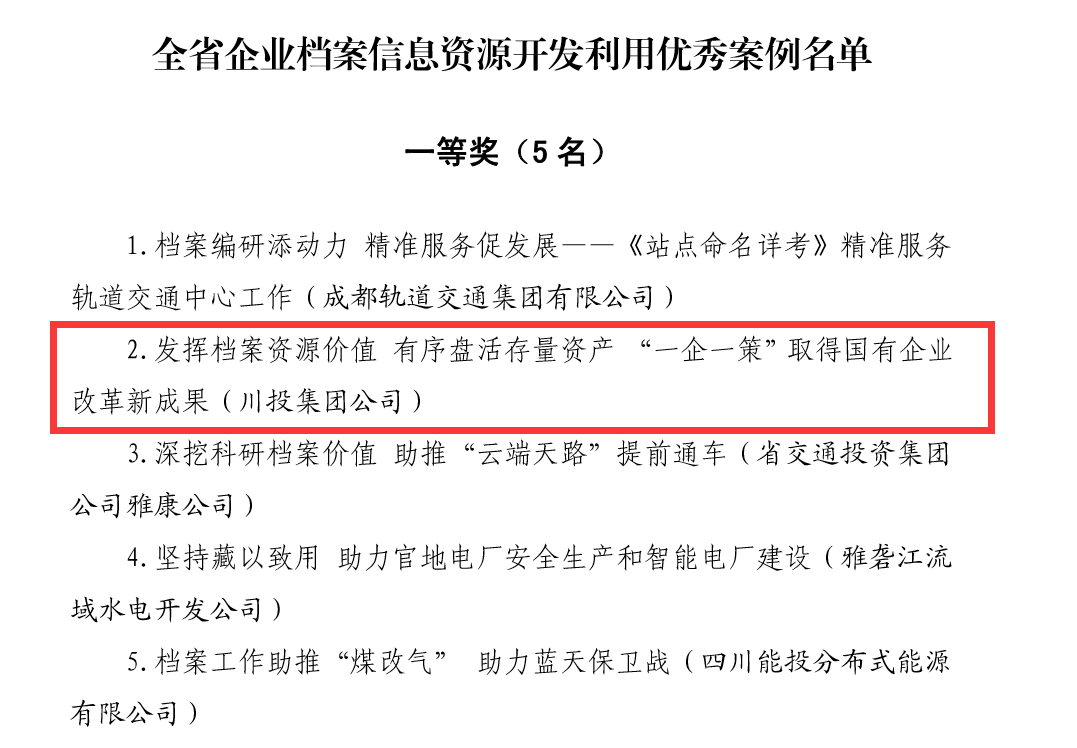 日前,四川省檔案局下發(fā)《關(guān)于表揚(yáng)全省企業(yè)檔案信息資源開發(fā)利用優(yōu)秀案例的通知》(川檔發(fā)〔2019〕10號),對全省企業(yè)檔案信息資源開發(fā)利用通報(bào)表彰,經(jīng)過企業(yè)申報(bào)、部門審核、專家評審和省檔案局研究,川投集團(tuán)檔案工作榮獲一等獎(jiǎng)。