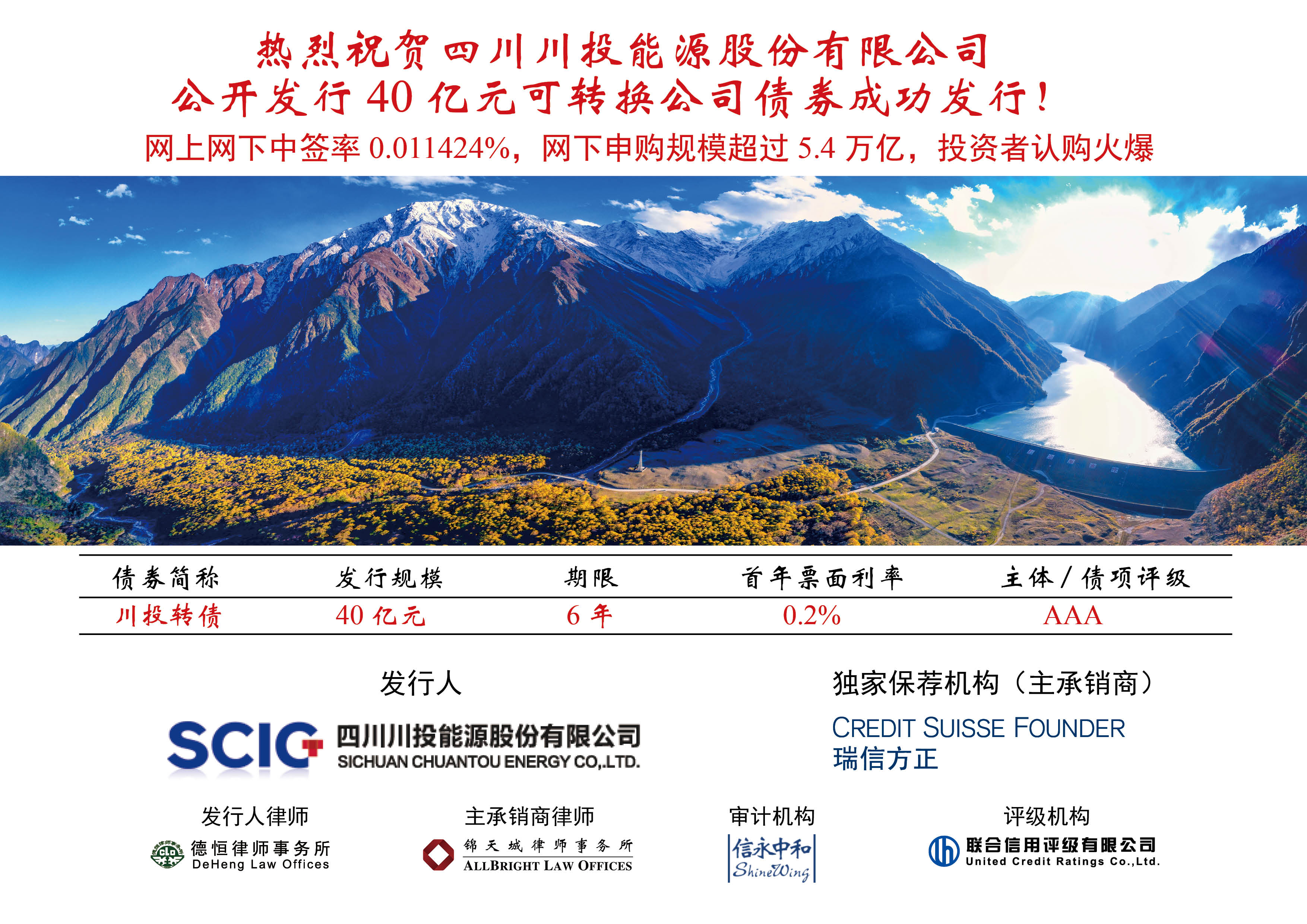 此次40億元可轉(zhuǎn)債的發(fā)行,不僅是川投能源歷史上規(guī)模最大的一次融資,更是川投能源時(shí)隔六年再次重啟資本市場的重大融資舉措,對于川投集團(tuán)和川投能源優(yōu)化融資債務(wù)結(jié)構(gòu),做優(yōu)做強(qiáng)做大能源主業(yè),以及促進(jìn)四川國資借力資本市場實(shí)現(xiàn)高質(zhì)量發(fā)展意義重大!