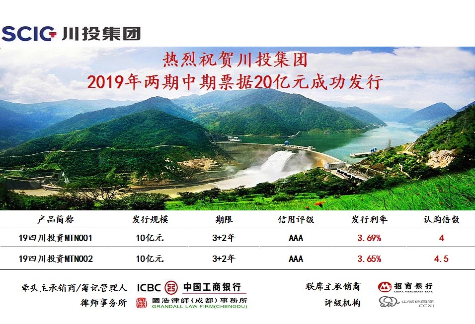 川投集團成功發(fā)行2019年中期票據(jù)20億元,債券期限3+2年,主體和債項評級均為AAA,發(fā)行平均利率3.67%,發(fā)行利率低于當(dāng)期AAA級同期限企業(yè)債務(wù)融資工具定價估值81BP,低于同期人民銀行貸款基準(zhǔn)利率108BP,刷新了近兩月同期限同等級中票發(fā)行最低價記錄,創(chuàng)造了川投集團歷年債券發(fā)行利率新低。