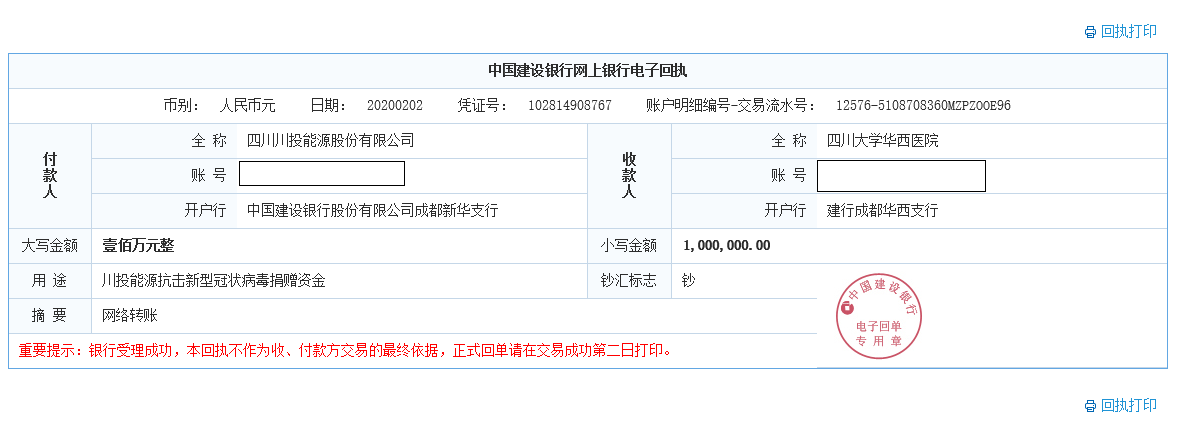 2月2日,由川投集團控股的川投能源向我省一線醫(yī)療救助機構(gòu)——四川大學(xué)華西醫(yī)院捐贈現(xiàn)金一百萬元,專項用于本次新型冠狀病毒肺炎疫情防控工作,以實際行動彰顯國有控股上市公司的社會責(zé)任和企業(yè)公民義務(wù)。