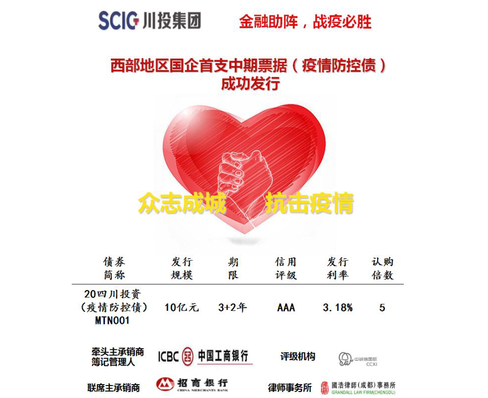 為落實好疫情防控責(zé)任,多措并舉做好民生保障服務(wù),充分發(fā)揮國企優(yōu)勢。2月20日,川投集團(tuán)成功發(fā)行西部地區(qū)國企首支中期票據(jù)(疫情防控債)10億元,債券期限3+2年,認(rèn)購倍數(shù)5倍,發(fā)行利率3.18%,低于當(dāng)期AAA級同期限企業(yè)債務(wù)融資工具定價估值80BP,低于同期人民銀行貸款基準(zhǔn)利率157BP,刷新了今年以來全國同期限同等級中票發(fā)行最低價記錄。