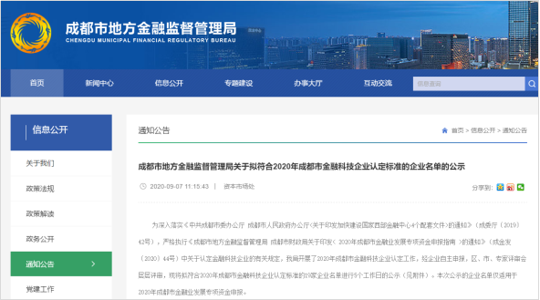 根據(jù)《中共成都市委辦公廳 成都市人民政府辦公廳關(guān)于印發(fā)加快建設(shè)國(guó)家西部金融中心 4 個(gè)配套文件的通知》 (成委廳〔2019〕42 號(hào))相關(guān)規(guī)定,為支持我市金融科技產(chǎn)業(yè)創(chuàng)新發(fā)展,成都市地方金融監(jiān)督管理局組織開展 2020 年成都市金融科技企業(yè)認(rèn)定工作。此次評(píng)選嚴(yán)格列舉2019年度為金融機(jī)構(gòu)提供服務(wù)收入占當(dāng)年企業(yè)主營(yíng)收入比例不低于50%為基礎(chǔ)條件,具有與開展主營(yíng)業(yè)務(wù)相對(duì)應(yīng)的區(qū)塊鏈、物聯(lián)網(wǎng)、人工智能、大數(shù)據(jù)、云計(jì)算、生物識(shí)別等領(lǐng)域自主知識(shí)產(chǎn)權(quán)等多項(xiàng)要求。