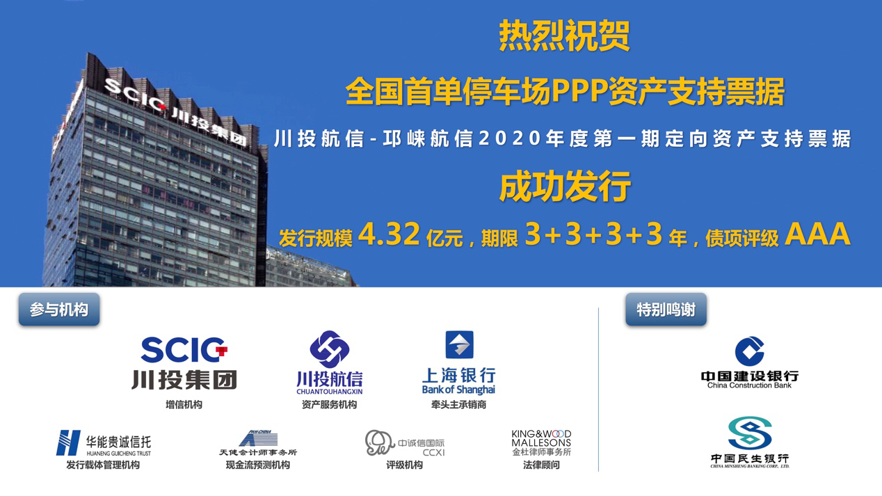 10月13日,全國(guó)首單停車(chē)場(chǎng)PPP資產(chǎn)支持票據(jù)(ABN)——“邛崍市航信物業(yè)管理有限責(zé)任公司2020年度第一期定向資產(chǎn)支持票據(jù)”在銀行間市場(chǎng)成功發(fā)行!