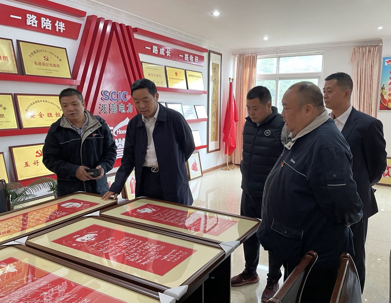 鄧凱一行實(shí)地查看了天彭電力基層黨組織陣地、鳳鳴橋車(chē)間和“小莊工作室”。本次集團(tuán)慶祝建黨100周年剪紙展覽主要依托天彭電力黨員莊叢燦老師的“小莊工作室”積極籌備,莊叢燦老師是非遺剪紙文化傳承人,將帶領(lǐng)其他3名黨員職工在5月底前完成100幅以共產(chǎn)黨成立100周年重大歷史脈絡(luò)的剪紙創(chuàng)作。鄧凱一邊仔細(xì)閱看莊叢燦老師已完成的剪紙作品,一邊和他親切交談,詳細(xì)了解剪紙創(chuàng)作情況,充分肯定了其剪紙作品的藝術(shù)成果,并代表集團(tuán)黨委送上了深切的關(guān)懷和慰問(wèn)。