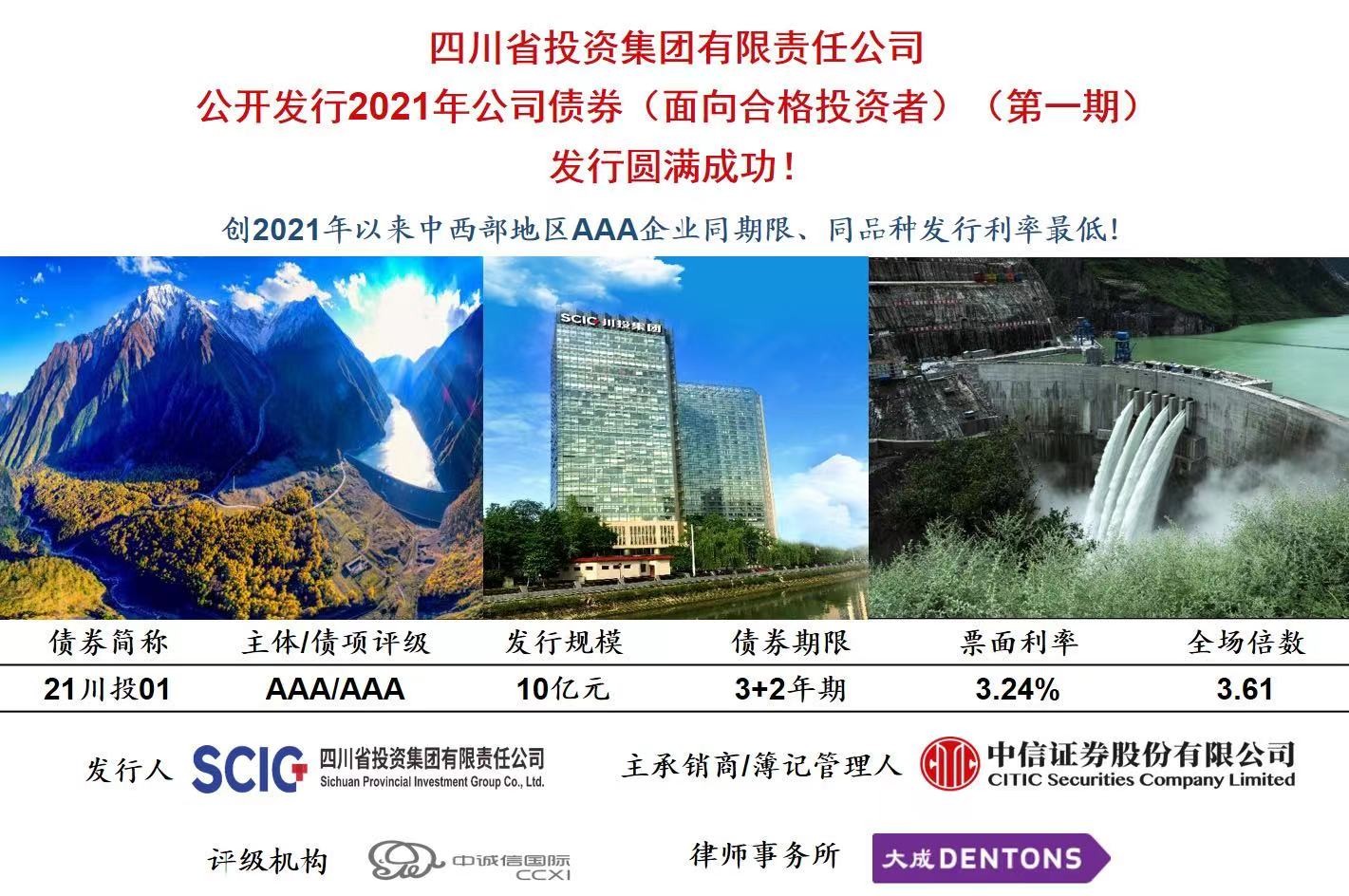 7月19日,川投集團2021年公司債券(面向合格投資者)(第一期)在上海證券交易所成功發(fā)行。本期公司債券發(fā)行規(guī)模10億元,債券期限3+2年,主體評級和債項評級均為AAA,發(fā)行票面利率3.24%,低于央行長期限LPR定價141個BP,創(chuàng)歷年公司債券發(fā)行利率新低,創(chuàng)2021年以來中西部地區(qū)AAA企業(yè)同期限、同品種發(fā)行利率最低,債券存續(xù)期間可累計為企業(yè)節(jié)省利息支出約7050萬元。