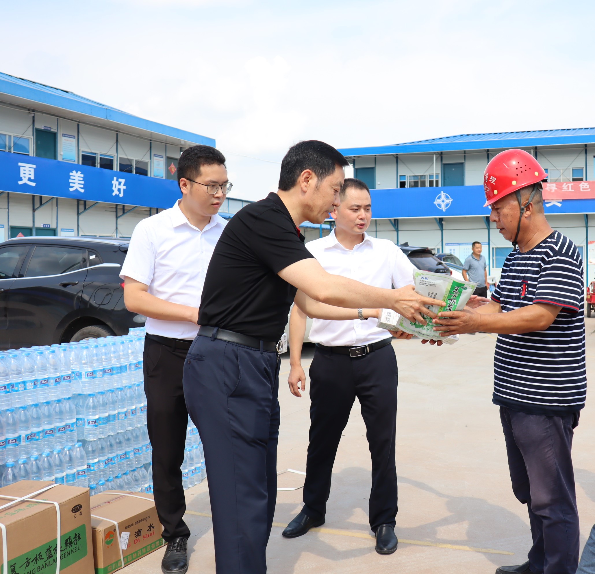 鄧凱一行深入中國牙谷項目施工現(xiàn)場和資陽口腔職業(yè)學院,代表集團公司對在高溫下堅守一線的施工人員、教職員工表示了親切的關懷和慰問,將消暑物資送到大家手中,提醒大家做好防暑降溫措施,在保障安全的前提下開展施工管理和學院運行管理工作。