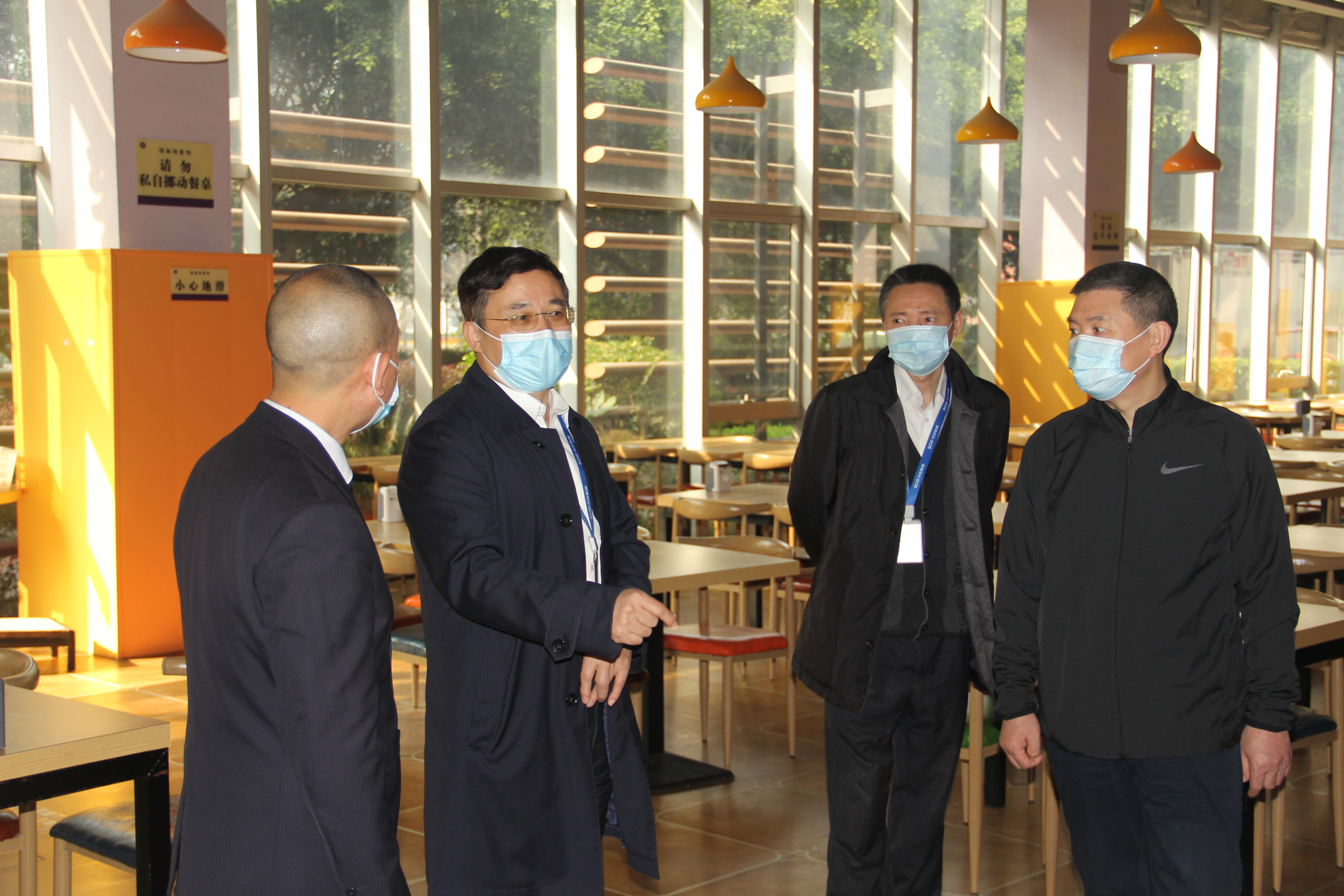 王懷林一行先后檢查了兩棟大廈的進(jìn)出口、職工食堂等關(guān)鍵點(diǎn)位的防控工作,詳細(xì)了解了大廈進(jìn)出口人員排查登記、值班值守、后勤保障、環(huán)境消殺、物資儲(chǔ)備等防疫措施落實(shí)情況。