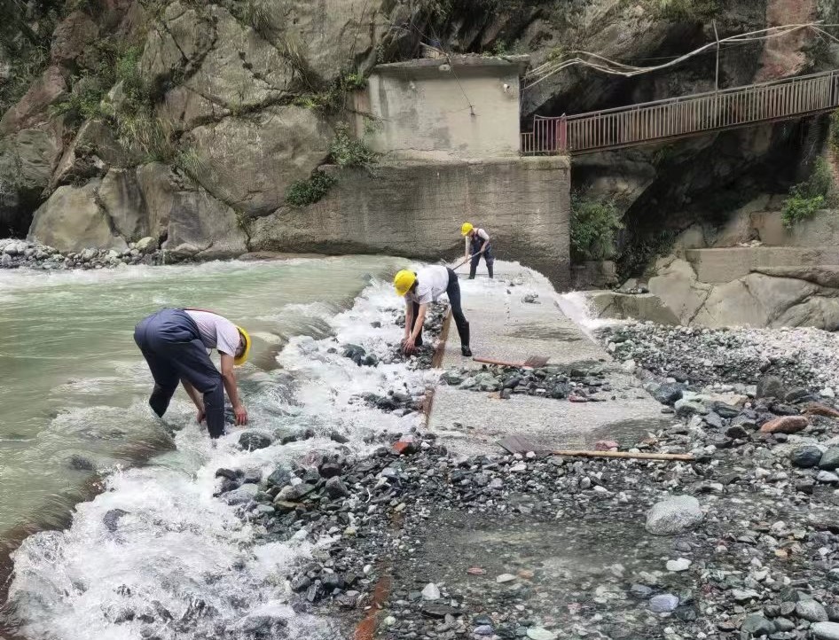 為此,天彭電力上下聯(lián)動,全員作戰(zhàn),沙金車間、鳳鳴橋車間一線堅守責任到崗、迅速行動,頂著烈日清理底格欄柵壩壩面砂石、庫區(qū)進水閘浮渣和前池淤積物,嚴格執(zhí)行“每日一小撈、三日一大撈、洪水天天撈”制度,做到多引水和保水源“兩手抓、兩手硬”,從源頭上守住保水保電的“生命線”。