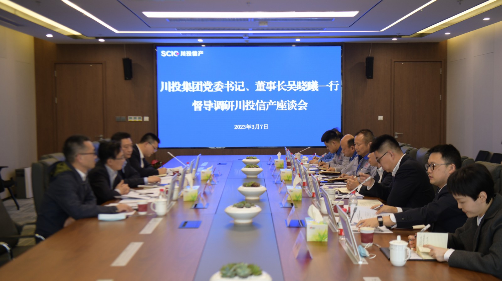 3月7日,集團(tuán)公司黨委書記、董事長吳曉曦率隊(duì)赴川投信產(chǎn)調(diào)研。集團(tuán)公司財(cái)務(wù)總監(jiān)黃勁,總經(jīng)理助理李勝章陪同調(diào)研。