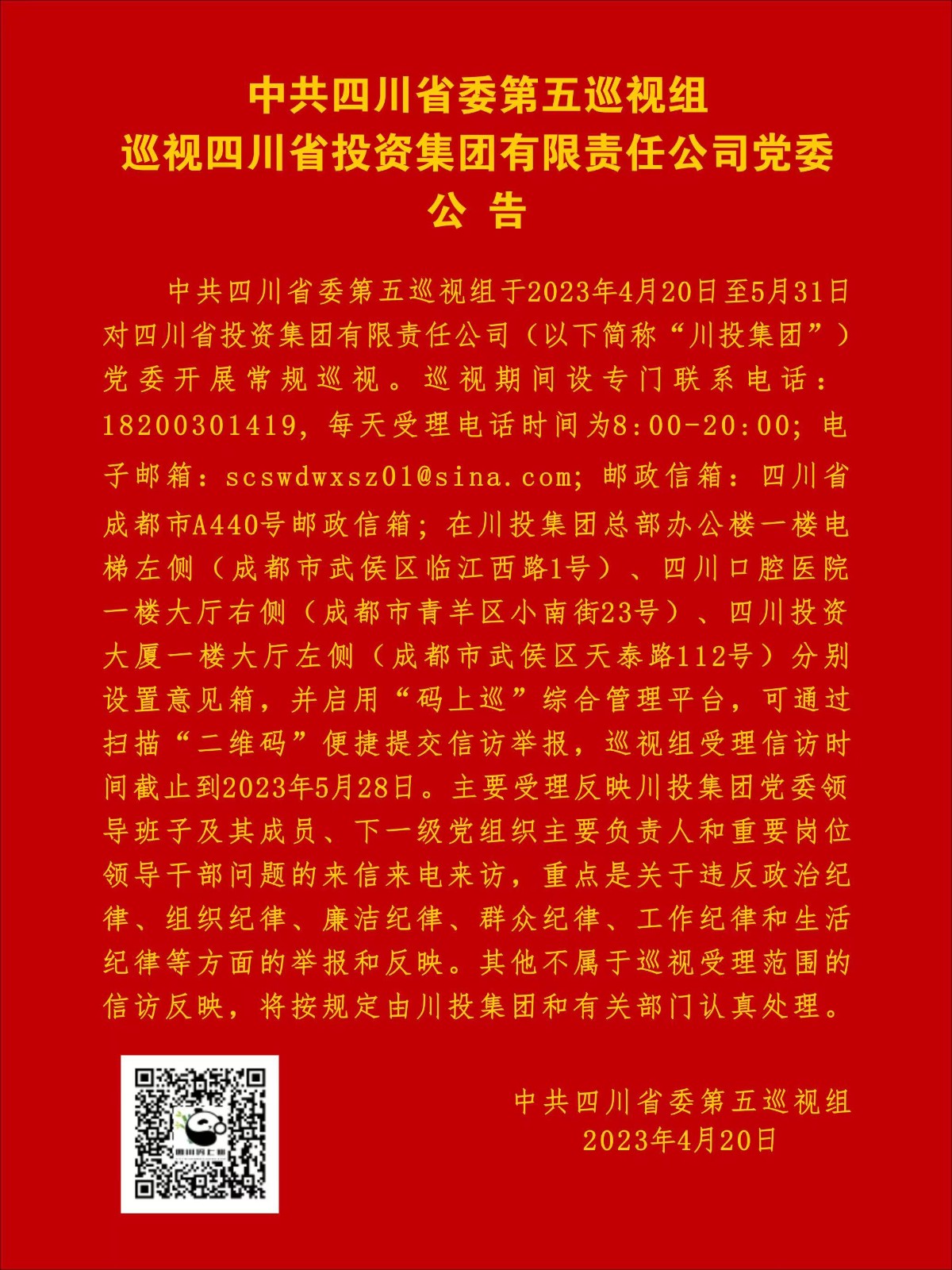 根據(jù)省委巡視工作統(tǒng)一部署,2023年4月20日,省委第五巡視組巡視四川省投資集團(tuán)有限責(zé)任公司(簡稱“川投集團(tuán)”)黨委工作動(dòng)員會(huì)召開。會(huì)前,巡視組召開了與川投集團(tuán)主要領(lǐng)導(dǎo)的見面溝通會(huì)。