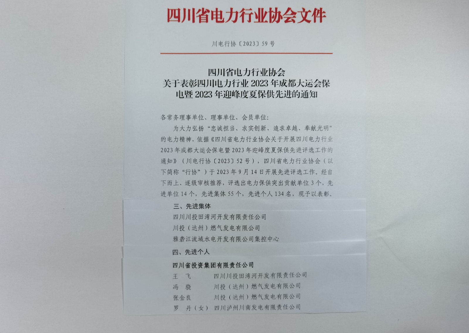 近日,由四川省電力行業(yè)協(xié)會(huì)組織開展的2023年成都大運(yùn)會(huì)保電暨2023年迎峰度夏保供先進(jìn)評(píng)選結(jié)果揭曉,田灣河公司榮獲“先進(jìn)集體”,公司員工王飛榮獲“先進(jìn)個(gè)人”。