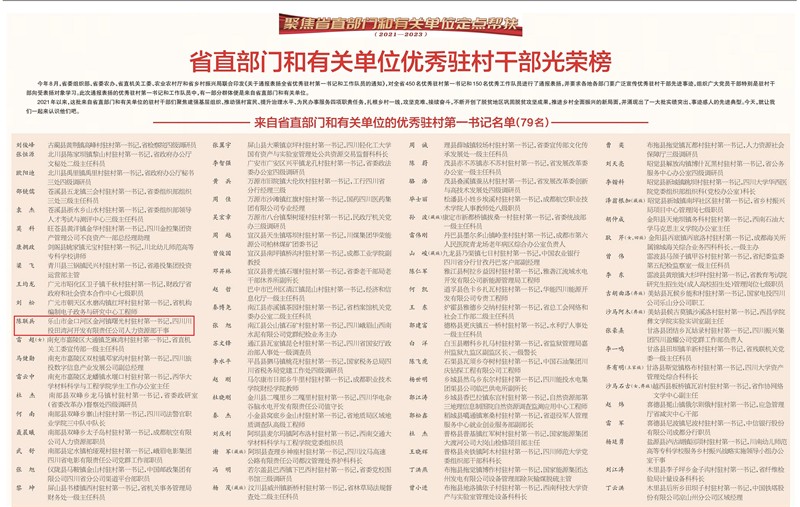 日前,四川省委組織部聯(lián)合省委農(nóng)辦、省直機關(guān)工委、農(nóng)業(yè)農(nóng)村廳和省鄉(xiāng)村振興局印發(fā)《關(guān)于通報表揚全省優(yōu)秀駐村第一書記和工作隊員的通知》,對全省優(yōu)秀駐村第一書記、工作隊員進行通報表揚。川投集團選派駐村干部、樂山市金口河區(qū)金河鎮(zhèn)曙光村第一書記,四川川投田灣河開發(fā)有限責任公司人力資源部干事陳聯(lián)兵榜上有名,獲評“全省優(yōu)秀駐村第一書記”。