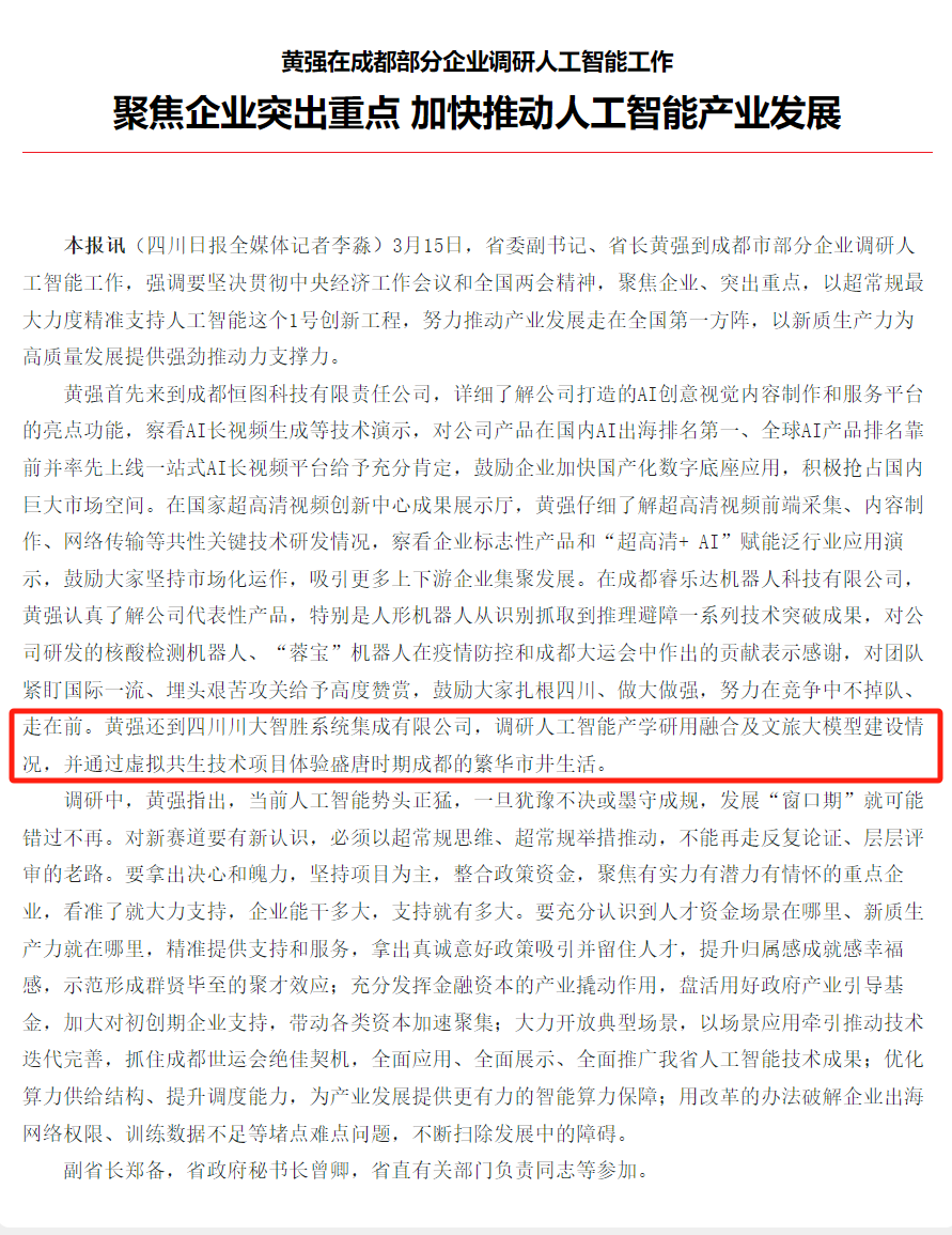 3月15日,省委副書記、省長黃強到成都市部分企業(yè)調(diào)研人工智能工作,強調(diào)要堅決貫徹中央經(jīng)濟工作會議和全國兩會精神,聚焦企業(yè)、突出重點,以超常規(guī)最大力度精準支持人工智能這個1號創(chuàng)新工程,努力推動產(chǎn)業(yè)發(fā)展走在全國第一方陣,以新質(zhì)生產(chǎn)力為高質(zhì)量發(fā)展提供強勁推動力支撐力。