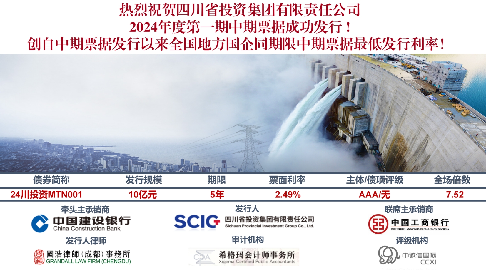 4月18日,川投集團成功發(fā)行2024年度第一期中期票據(jù),創(chuàng)下自中期票據(jù)發(fā)行以來四川省同期限中期票據(jù)最低發(fā)行利率和全國地方國企同期限中期票據(jù)的最低發(fā)行利率記錄。
