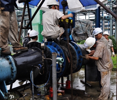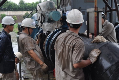 由于16日晚到17號(hào)上午的持續(xù)暴雨,造成了江邊取水泵房旁的山體塌方,廠區(qū)取水管道,電線電纜統(tǒng)統(tǒng)拉斷,取水工作已無(wú)法進(jìn)行。公司領(lǐng)導(dǎo)迅速組織各部門緊急會(huì)診,提出新敷設(shè)管道并入樂(lè)電天威江邊取水管道的方案,在得到樂(lè)電天威的支持后立即實(shí)施,電氣維修員在最短的時(shí)間內(nèi)搶修好配電箱,建立了臨時(shí)施工電源,確保了碰口工作順利完成。