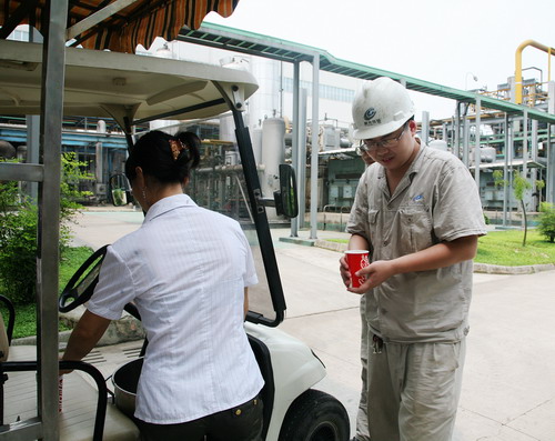 三是堅(jiān)持“以人為本”,加大防暑降溫的資金投入,不斷改善員工工作環(huán)境,加強(qiáng)后勤保障工作。為了給現(xiàn)場(chǎng)一線操作人員送去夏日清涼,公司為6號(hào)廠房配置露天太陽(yáng)傘,有效減少了陽(yáng)光直射,降低溫度;將閑置空調(diào)安裝到現(xiàn)場(chǎng)精餾工段休息室。為防止員工中暑,公司為員工發(fā)放藿香正氣水及人丹防暑降溫藥品,每天為一線各崗位運(yùn)送清涼飲料。
