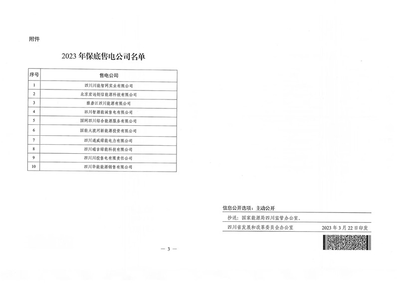 3月22日,四川省發(fā)展和改革委員會、四川省能源局印發(fā)了《關于明確四川電力市場2023年保底售電公司的通知》(川發(fā)改能源〔2023〕132號),四川川投售電有限責任公司被評定為四川電力市場2023年保底售電公司。