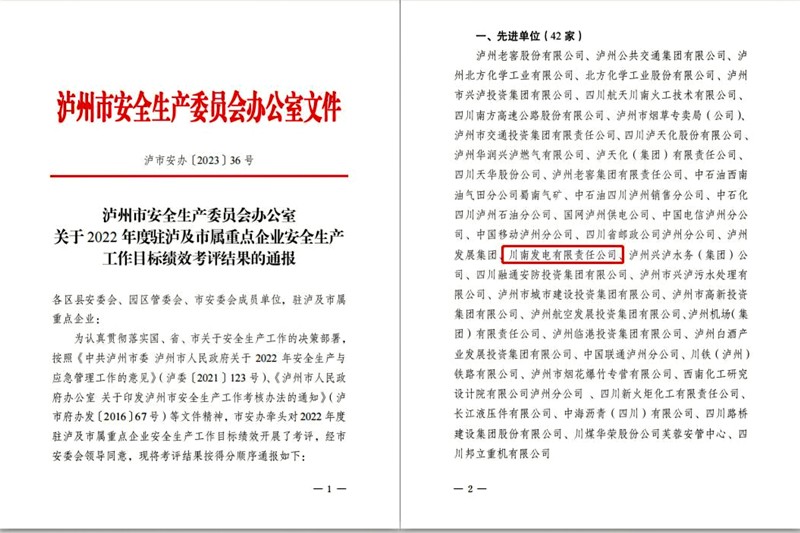 近日,瀘州市安全生產(chǎn)委員會辦公室印發(fā)了《關(guān)于2022年度駐瀘及市屬重點企業(yè)安全生產(chǎn)工作目標績效考核的通報》,公司獲2022年度瀘州市安全生產(chǎn)“先進單位”表彰。