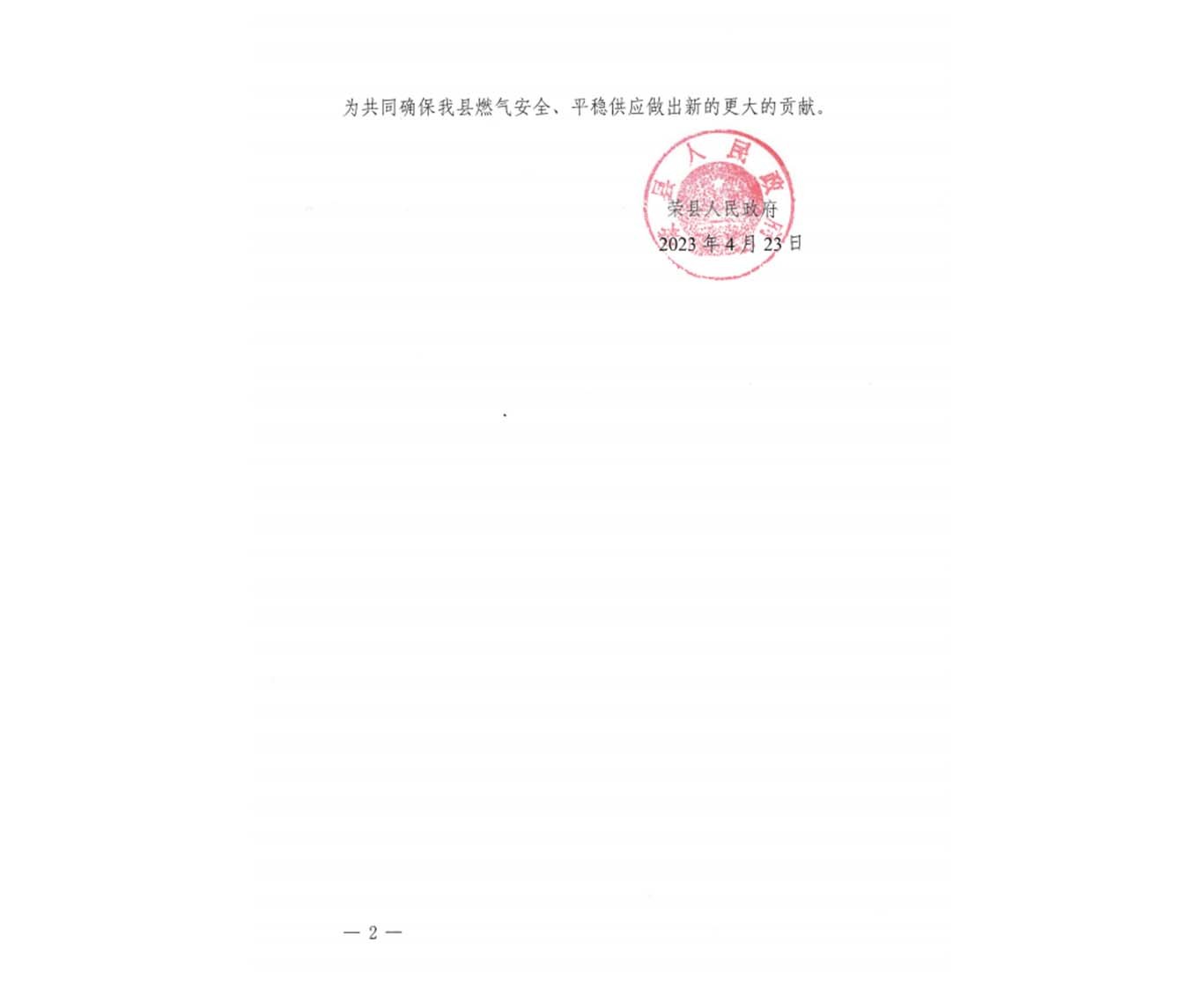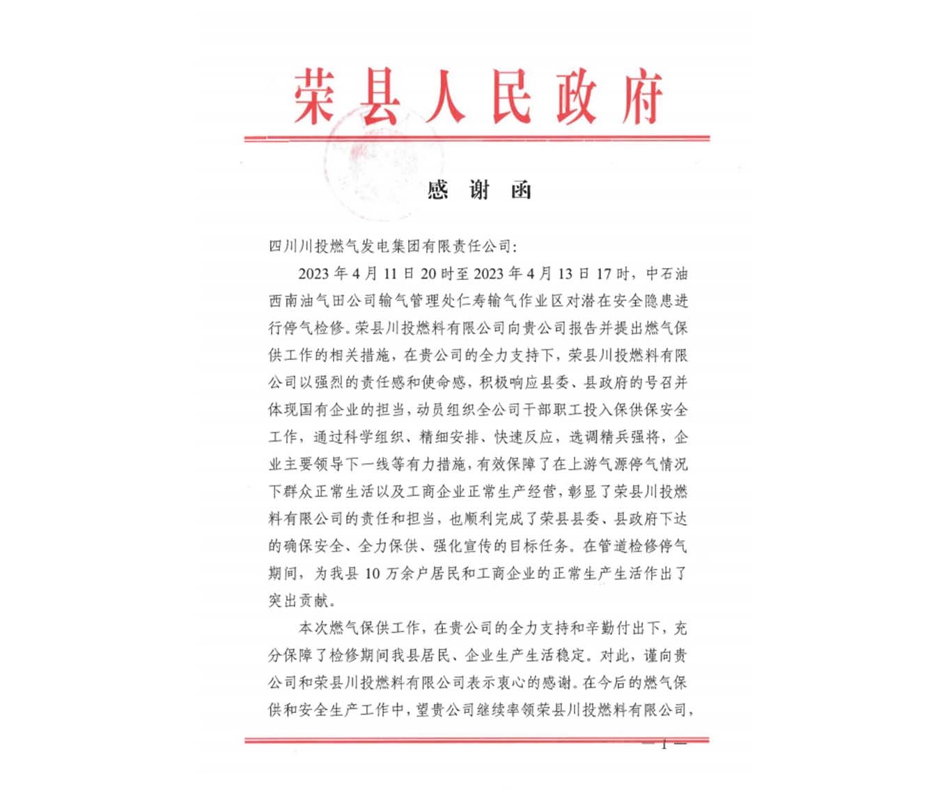 4月23日,川投燃電收到榮縣人民政府發(fā)來的感謝函,對川投燃電及所屬榮縣川燃公司在中石油西南油氣田公司輸氣管理處仁壽輸氣作業(yè)區(qū)管道檢修停氣期間有效保障榮縣10萬余戶居民和企業(yè)正常生產(chǎn)生活所作出的重要貢獻(xiàn)表示衷心地感謝。
