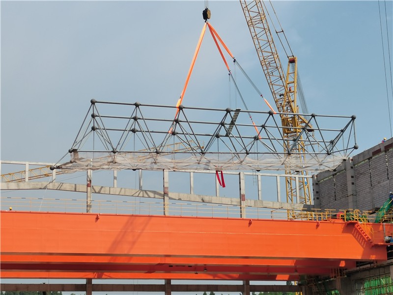 2023年6月9日8時(shí)18分,資陽燃?xì)怆娬局鲝S屋面網(wǎng)架開始吊裝。