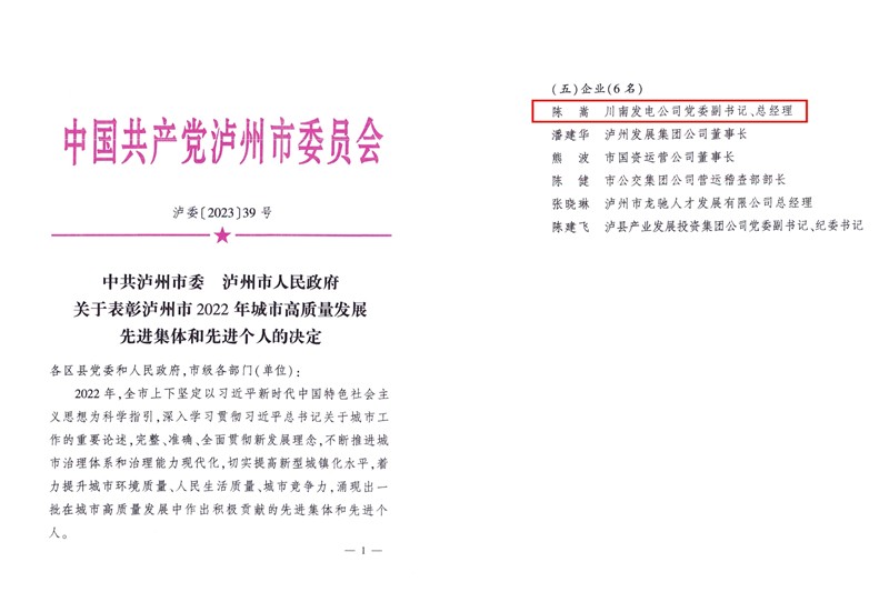 近期,中共瀘州市委、瀘州市人民政府發(fā)布了《關于表彰瀘州市2022年城市高質量發(fā)展先進集體和先進個人的決定》,公司黨委副書記、總經(jīng)理陳嵩獲“瀘州市2022年城市高質量發(fā)展先進個人”通報表彰,是榮獲表彰的6家企業(yè)先進個人之一。