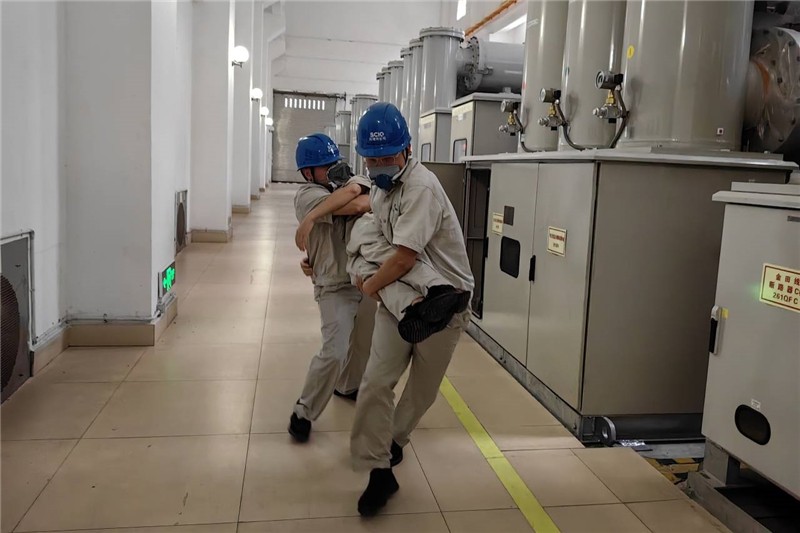 此次演練,模擬一名電氣班工作人員在大發(fā)電站GIS室巡視檢查時突遇SF6氣體泄漏,吸入SF6氣體后出現(xiàn)輕度昏迷。大發(fā)值班人員通過SF6氣體泄漏警報裝置聲光信號以及視頻監(jiān)控發(fā)現(xiàn)現(xiàn)場有人倒地,立即大聲呼救,并迅速啟動GIS室強力通風裝置,召集臨近的同事,戴上防護面具緊急轉(zhuǎn)移昏迷員工到集控中心停車場,立刻向班組值班負責人匯報并守護現(xiàn)場。班組負責人接到通知后,第一時間將相關情況向部門值班負責人報告,同時撥打120急救電話并前往現(xiàn)場,查看傷員情況,并啟動《危險化學品中毒傷亡事故現(xiàn)場處置方案》,現(xiàn)場成立應急救援小組,開展應急處置。醫(yī)療救護組趕到現(xiàn)場,進行現(xiàn)場初步處置:檢查傷者意識情況、呼吸情況、身體其它受傷情況等,并在當?shù)蒯t(yī)院醫(yī)生電話指導下救助傷者,等候救護車的到來;同時,事故搶險組穿戴專業(yè)防護用具后,再次確認通風設備強制排風功能是否開啟,架設圍欄及警戒標識,對漏氣設備進行檢測,并對泄漏點進行處理。整個演練過程緊張有序,參演人員沉著冷靜,《危險化學品中毒傷亡事故現(xiàn)場處置方案》流程得到了逐一驗證。