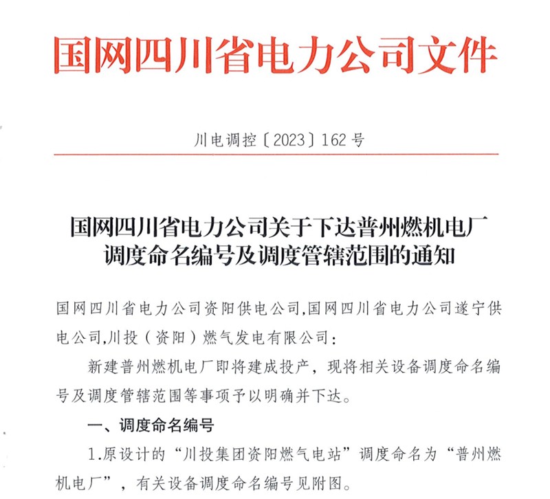 9月25日,資陽(yáng)氣電收到國(guó)網(wǎng)四川省電力公司下發(fā)的《國(guó)網(wǎng)四川省電力公司關(guān)于下達(dá)普州燃機(jī)電廠調(diào)度命名編號(hào)及調(diào)度管轄范圍的通知》,川投集團(tuán)資陽(yáng)燃?xì)怆娬菊{(diào)度正式命名為:“普州燃機(jī)電廠”。