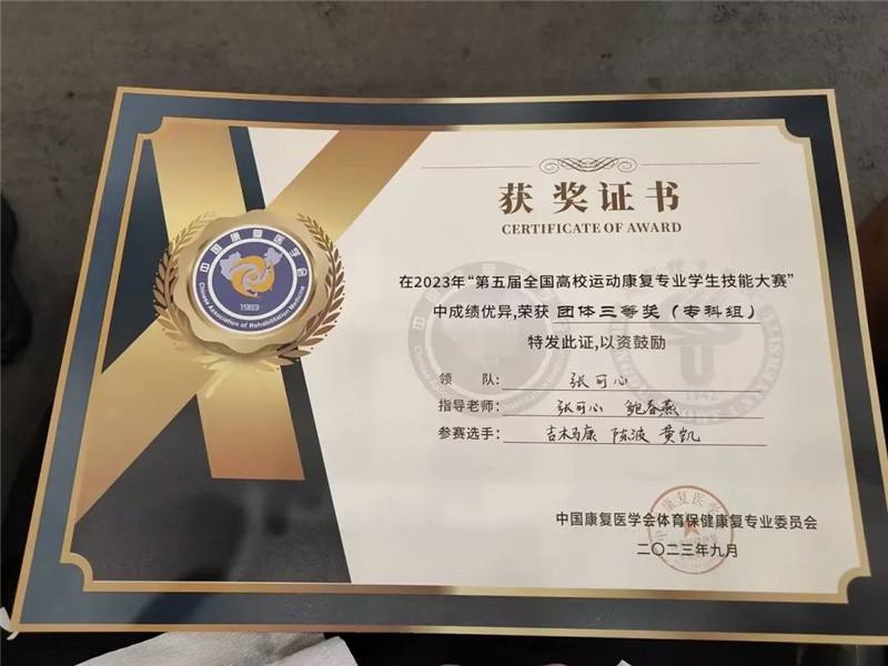 本次大賽采取“理論考試+技能操作”組合方式進(jìn)行,重在考評學(xué)生專業(yè)基礎(chǔ)理論和專業(yè)基本操作,涵蓋了心肺復(fù)蘇、運動防護(hù)、肌肉骨骼康復(fù)、運動處方等多個領(lǐng)域的內(nèi)容。通過前期選拔與考核,由吉木馬康,黃凱,陳波三名學(xué)生組成代表隊,在指導(dǎo)教師張可心、鮑春燕的帶領(lǐng)下,在本次大賽中不畏強手、奮勇拼搏,榮獲團(tuán)體三等獎,全能比賽三等獎、運動防護(hù)、理論考試、肌肉骨骼康復(fù)賽道單項三等獎三項。