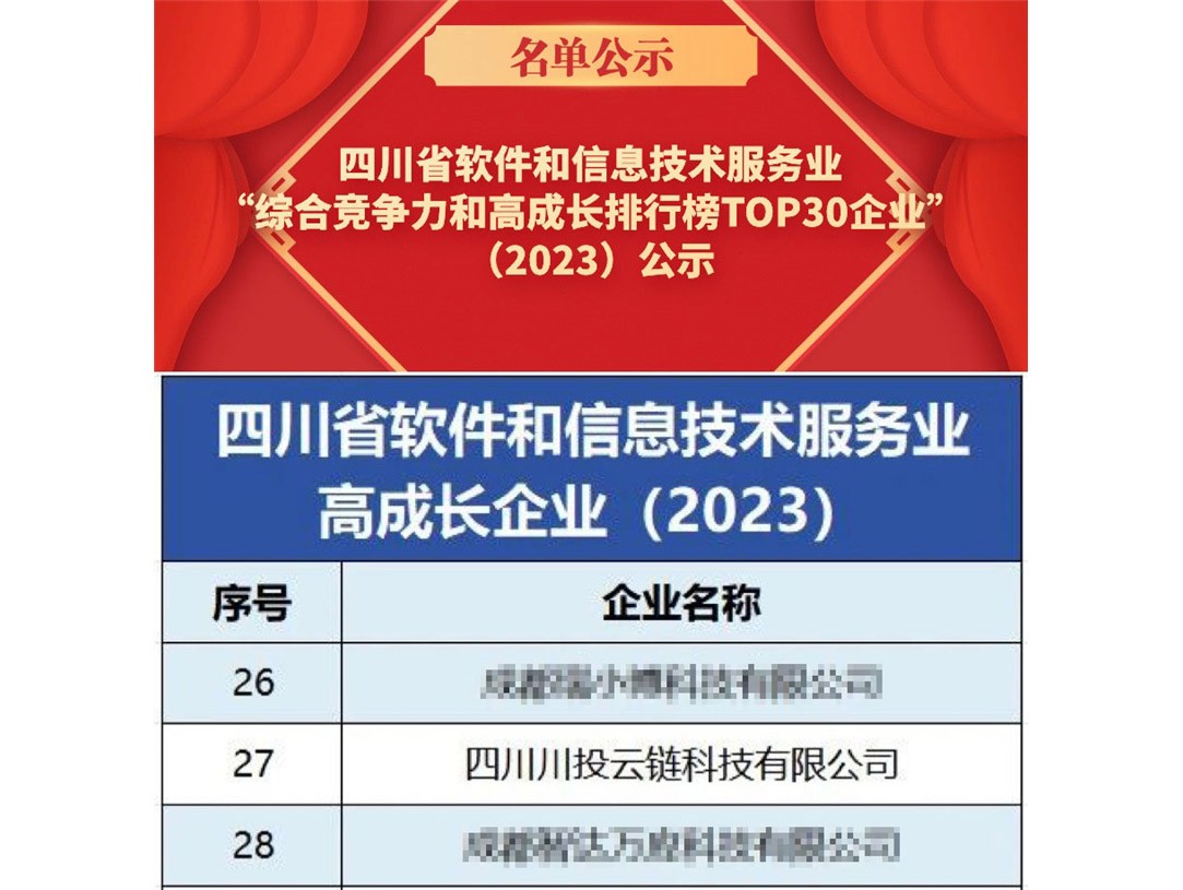 近日,四川省軟件行業(yè)協(xié)會(huì)完成了四川省軟件和信息技術(shù)服務(wù)業(yè)“綜合競(jìng)爭(zhēng)力和高成長(zhǎng)排行榜TOP30企業(yè)”(2023)公示,川投信產(chǎn)所屬川投云鏈憑借在科技創(chuàng)收能力、研發(fā)投入強(qiáng)度、產(chǎn)品競(jìng)爭(zhēng)力等方面的突出表現(xiàn)入選高成長(zhǎng)企業(yè)TOP30榜單。