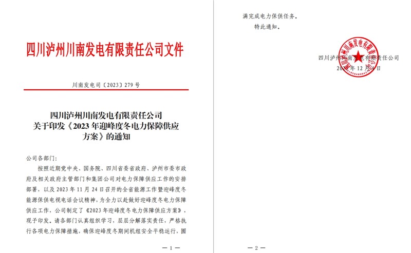 2023年入冬以來,四川電力供需處于緊平衡狀態(tài),全川燃煤發(fā)電機組能開盡開、應(yīng)發(fā)盡發(fā),其“兜底頂峰”保供頂梁柱作用進一步凸顯。公司堅決貫徹落實省委省政府、省國資委決策部署和瀘州市委市政府、川投集團各項工作安排,把電力保供作為當(dāng)前最重要的政治任務(wù),全面推進迎峰度冬保電各項工作。