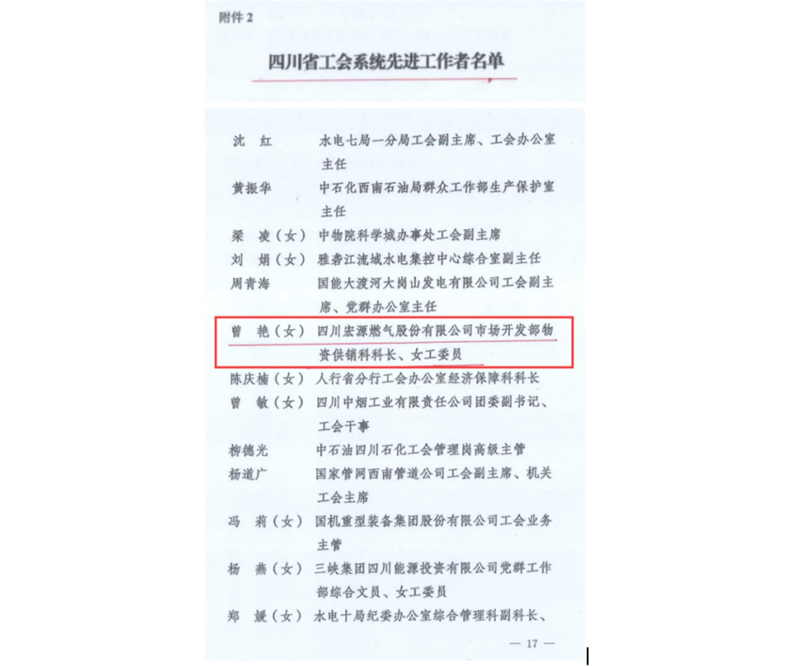 近日,“四川省工會(huì)系統(tǒng)先進(jìn)集團(tuán)和先進(jìn)工作者”獲評(píng)名單公布,川投燃電所屬宏源氣司市場(chǎng)開(kāi)發(fā)部物資供銷科科長(zhǎng)、工會(huì)女工委員曾艷被授予“四川省工會(huì)系統(tǒng)先進(jìn)工作者”榮譽(yù)稱號(hào)。