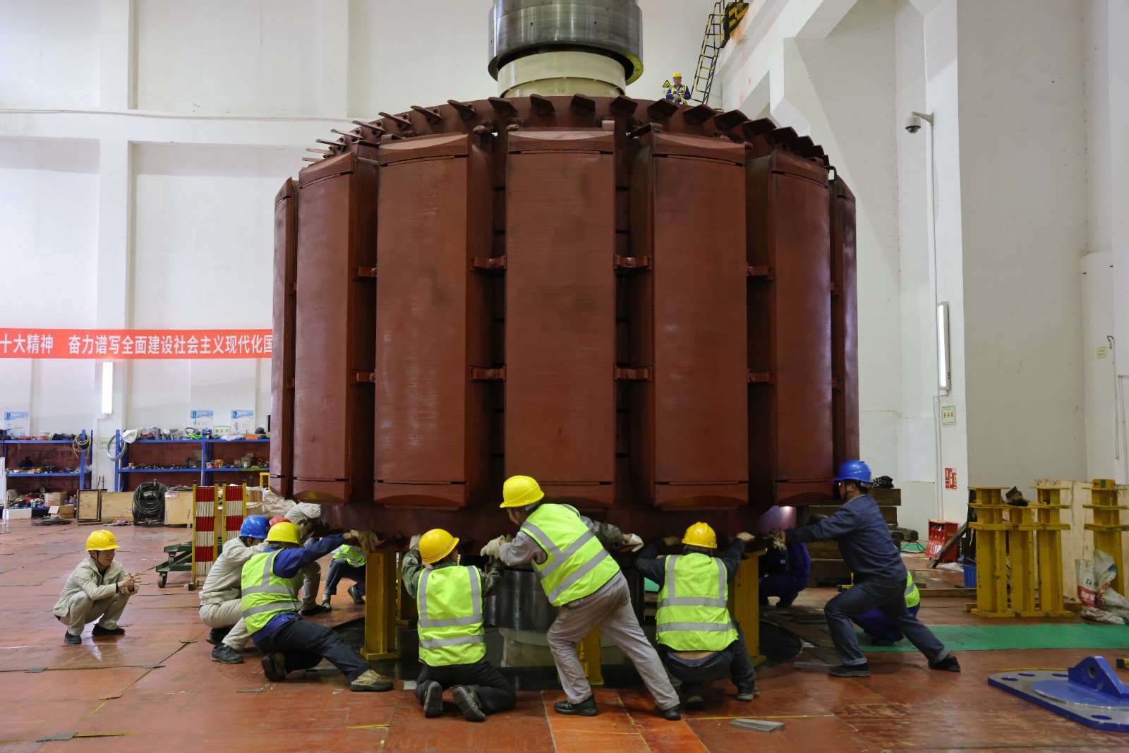 為確保轉(zhuǎn)子吊出一次性成功,轉(zhuǎn)子起吊前,田灣河公司機組大修監(jiān)理組專業(yè)技術(shù)人員會同施工方,對橋機再次進行了聯(lián)合檢查,對轉(zhuǎn)子吊出的各項準備工作進行再次確認,確保轉(zhuǎn)子吊出具備充分條件。14時許,各項安全保障措施準備就緒,檢修負責人向楊坤匯報各項準備工作并申請轉(zhuǎn)子吊出作業(yè),楊坤隨即下達“同意起吊”指令。經(jīng)過近一個半小時的持續(xù)奮戰(zhàn),重約260噸的轉(zhuǎn)子被平穩(wěn)地放在安裝間轉(zhuǎn)子支墩上,轉(zhuǎn)子吊出工作順利完成,金窩1#機組大修的首個關(guān)鍵節(jié)點目標如期實現(xiàn)。