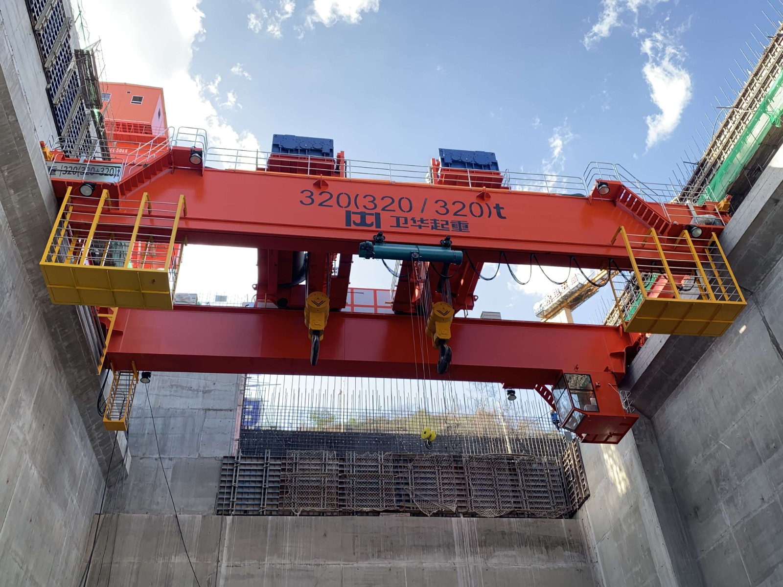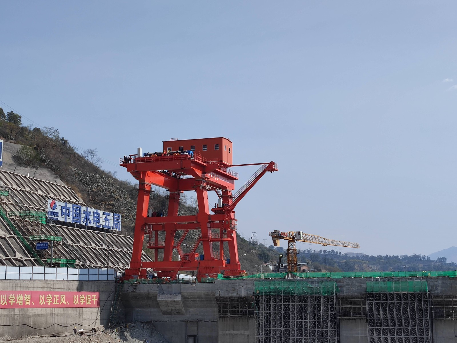 紅色門機(jī)迎江矗立。“大吊車真厲害,百噸設(shè)備輕而易舉提抓起來(lái)!”今年以來(lái),攀枝花廣大市民陡然發(fā)現(xiàn)銀江水電站大壩上架起了一個(gè)紅色的大型設(shè)備,從幾公里外的市區(qū)一眼望去就能映入眼簾,成為銀江水電站的新標(biāo)志。這個(gè)紅色巨物就是壩頂門機(jī),高25米,寬16米,最大起吊能力達(dá)到500噸,起升高度達(dá)75米,是水電站建設(shè)期金屬結(jié)構(gòu)安裝及后期電站運(yùn)行最重要的設(shè)備之一,2024年將肩負(fù)起包括36扇閘門在內(nèi)共計(jì)超萬(wàn)噸的設(shè)備起吊任務(wù)。為順利推進(jìn)施工,開(kāi)年以來(lái),川投能源攀水電公司通過(guò)增加臨時(shí)軌道提前籌備、堅(jiān)持春節(jié)不停工等措施,加快實(shí)施壩頂門機(jī)供貨安裝,計(jì)劃4月中旬投入使用。
