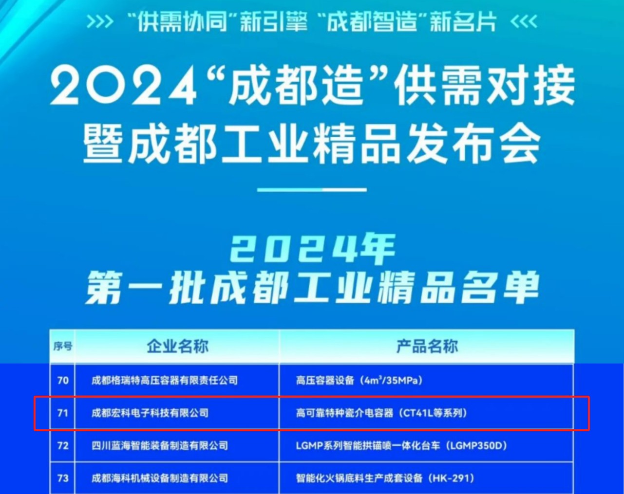 據(jù)悉,本次活動由成都市經(jīng)濟和信息化局市新經(jīng)濟發(fā)展委員會(成都市扶持名優(yōu)產(chǎn)品領導小組辦公室)主辦,旨在推動“成都造”企業(yè)增品種、提質量、創(chuàng)品牌,加快成都產(chǎn)品向成都品牌轉變。第一批成都工業(yè)精品共評選認定100家企業(yè)的100項產(chǎn)品,宏明宏科憑借高可靠特種瓷介電容器(CT41L等系列)產(chǎn)品成功入選。