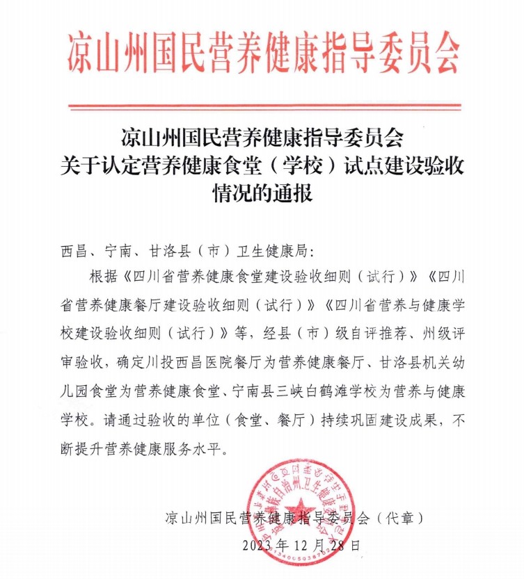 患者的營(yíng)養(yǎng)攝入,與身體恢復(fù)速度息息相關(guān),怎么樣吃的健康、吃的安心、吃得放心是大家關(guān)心的問題。自開診以來,川投西昌醫(yī)院高度重視營(yíng)養(yǎng)健康食堂建設(shè),積極為群眾提供舒適的餐食服務(wù),經(jīng)不斷努力,川投西昌醫(yī)院于2023年12月被評(píng)審為四川省營(yíng)養(yǎng)健康食堂,全州僅三家單位獲評(píng)。