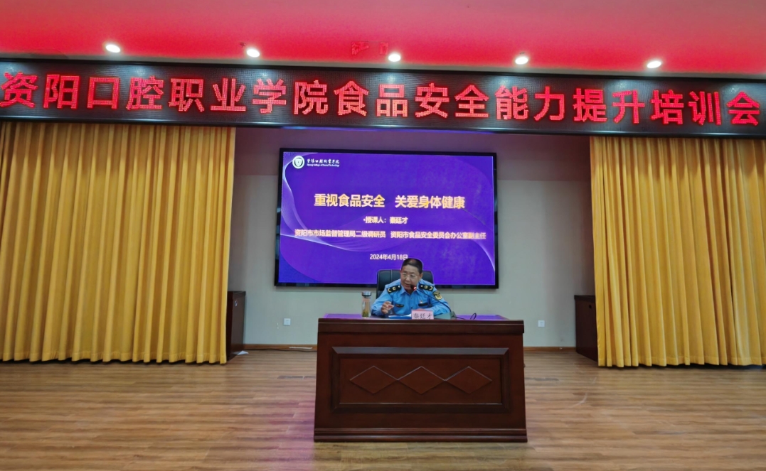 為進(jìn)一步提升食品安全法治理念,強(qiáng)化食品安全責(zé)任意識,提高校園食品安全管理水平。4月18日,資陽口腔職業(yè)學(xué)院組織召開2024年食品安全能力提升培訓(xùn)會,資陽市市場監(jiān)督管理局二級調(diào)研員、資陽市食品安全委員會辦公室副主任秦廷才進(jìn)行授課。