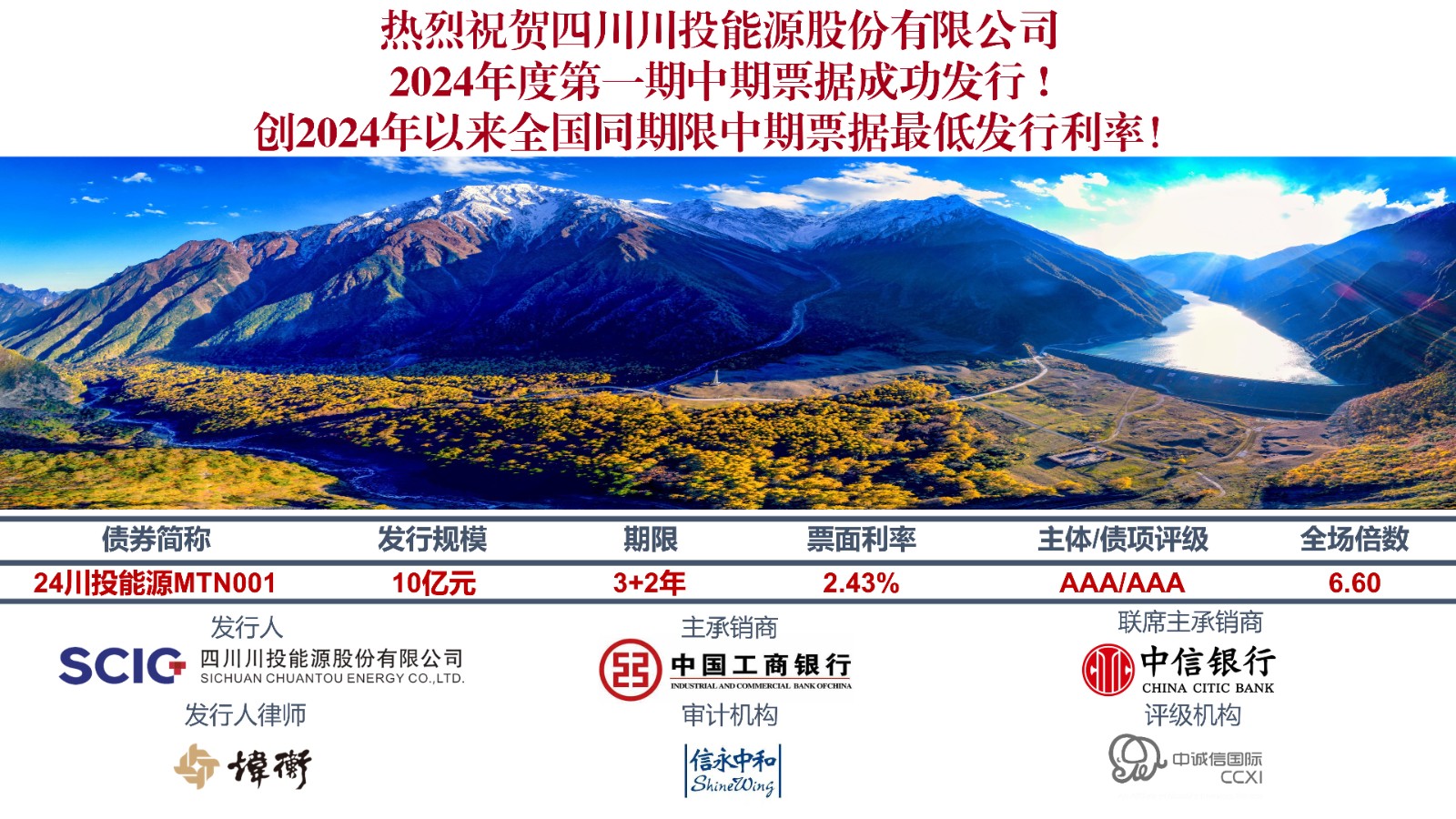416日,川投能源搶抓資本市場有利時間窗口成功發(fā)行2024年度第期中期票據(jù)。本期中期票據(jù)發(fā)行規(guī)模為10億元,發(fā)行期限3+2年,發(fā)行利率2.43%,創(chuàng)2024年以來全國同期限中期票據(jù)最低發(fā)行利率,同時也創(chuàng)公司中長期債券歷史最低發(fā)行利率。