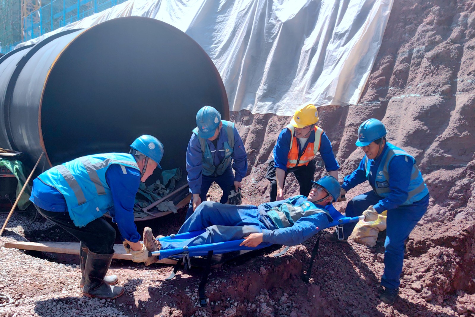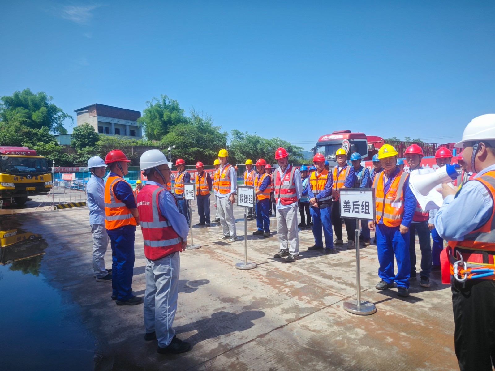 本次演練為醫(yī)療、救援、后勤、善后4個(gè)小組,采用實(shí)戰(zhàn)形式進(jìn)行演練。演練模擬場(chǎng)景為:5月13午,施工現(xiàn)場(chǎng)驟降暴雨造成循環(huán)水泵房北側(cè)的循環(huán)水管道基槽邊坡發(fā)生局部塌方,塌方導(dǎo)致基坑下方一名作業(yè)人員和工器具被掩埋,循環(huán)水泵房基坑內(nèi)流入大量積水,如不及時(shí)進(jìn)行抽排可能導(dǎo)致基坑邊坡浸泡發(fā)生大面積坍塌事故,需立即組織人員搶險(xiǎn)。接到險(xiǎn)情報(bào)警后防汛應(yīng)急指揮部迅速啟動(dòng)應(yīng)急機(jī)制,第一時(shí)間組織應(yīng)急救援隊(duì)火速趕赴目標(biāo)地點(diǎn),按照防汛應(yīng)急方案,著眼實(shí)戰(zhàn),進(jìn)行了緊急救險(xiǎn)、轉(zhuǎn)移傷員、人員排查、積水抽排應(yīng)急救援。