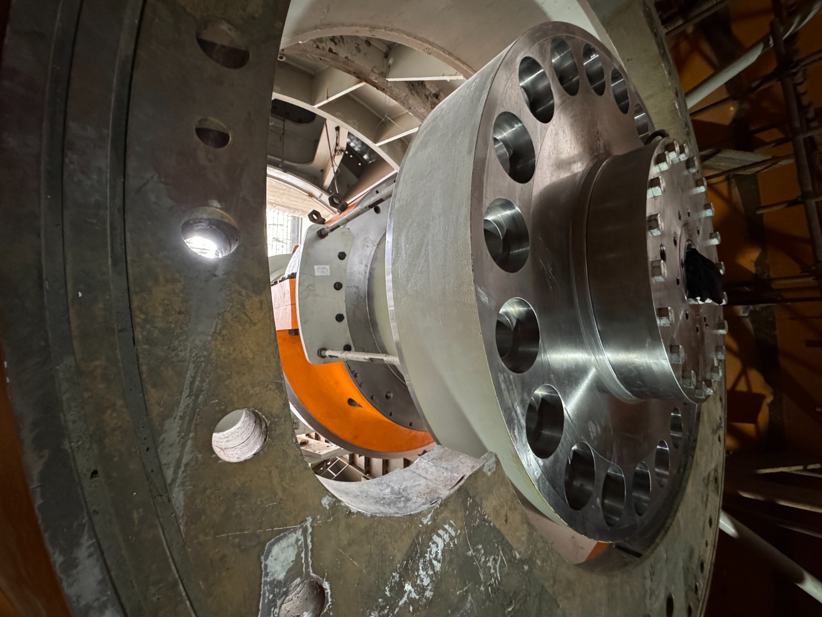 銀江水電站燈泡貫流式機組主軸為整鍛永久把合結(jié)構(gòu),總長9.6米,端部最大直徑2.83米,總重量142.66噸,順水流方向安裝,是連接發(fā)電機轉(zhuǎn)子和水輪機轉(zhuǎn)輪,傳遞各種工況條件下扭矩的核心轉(zhuǎn)動部件。主軸安裝精度高,中心位置需控制在0.5毫米以內(nèi),端部跳動需控制在0.03毫米以內(nèi)。