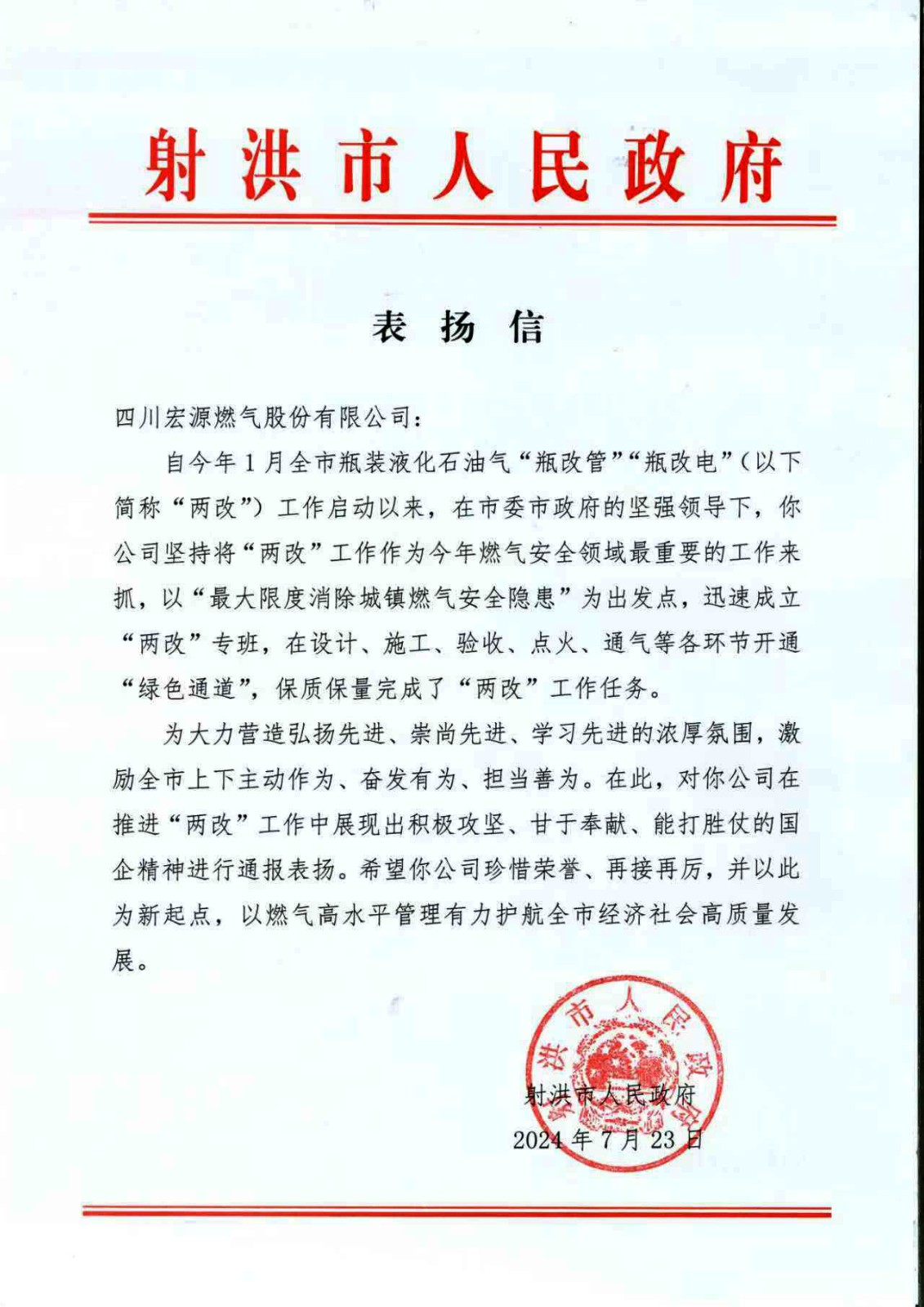 7月24日上午,宏源氣司因攻堅(jiān)克難、保質(zhì)保量完成瓶裝液化氣“瓶改管”工作任務(wù)受到射洪市人民政府通報(bào)表揚(yáng)。表揚(yáng)信中對(duì)宏源氣司在推進(jìn)“兩改”工作中所展現(xiàn)出的積極攻堅(jiān)、甘于奉獻(xiàn)、能打勝仗的國企精神和為射洪市經(jīng)濟(jì)社會(huì)發(fā)展做出的重要貢獻(xiàn)給予了充分肯定。