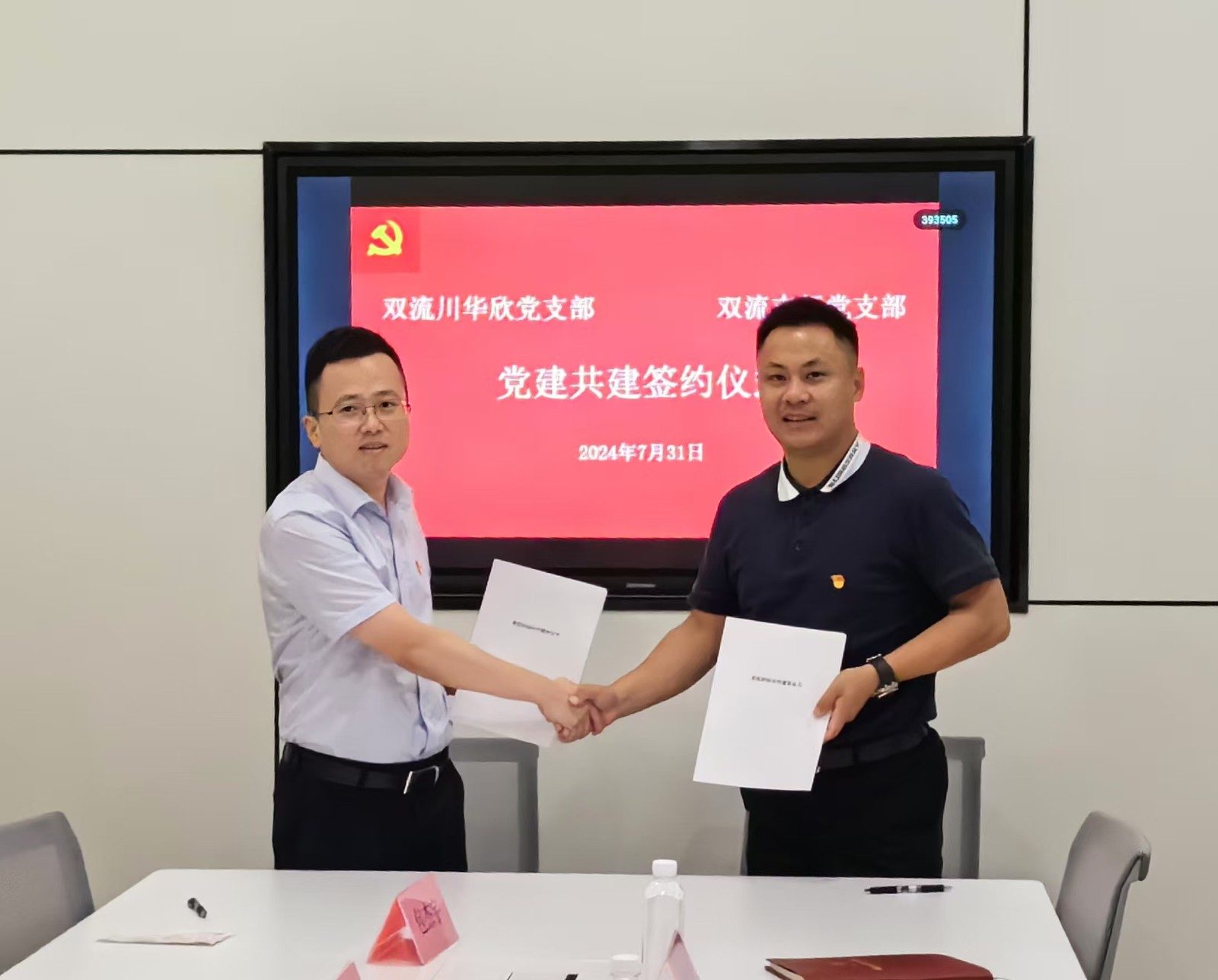 雙流川華欣黨支部副書(shū)記周揚(yáng)鑫、四川銀行雙流支行黨支部書(shū)記凌胤欽出席簽約儀式并代表雙方簽署“黨建結(jié)對(duì)共建活動(dòng)”協(xié)議書(shū)。