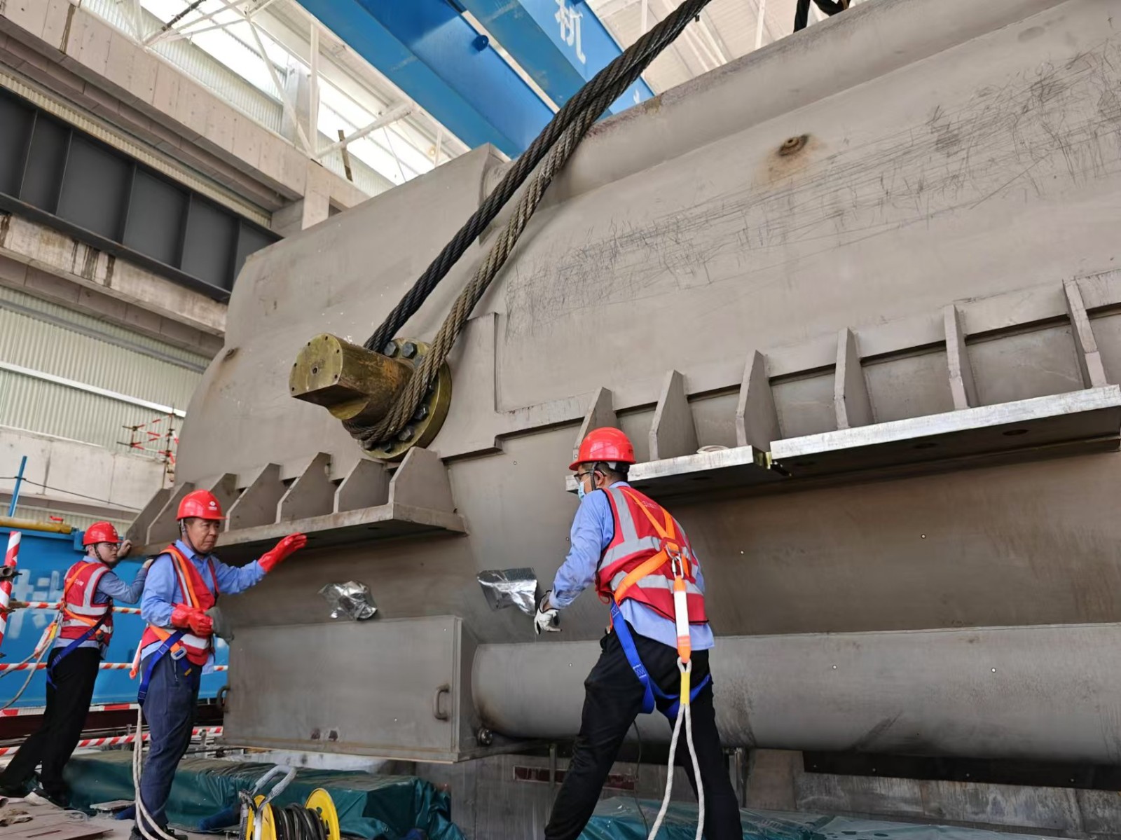 發(fā)電機定子作為主廠房內(nèi)最重的單體設備,長10.3米、寬4.868米、高4.7米,重達367噸。為確保發(fā)電機定子吊裝平穩(wěn)、就位精準,項目建設團隊組織制定詳細的吊裝施工方案,提前做好設備和工器具保障,從場外運輸至場內(nèi)卸車全過程反復推演,逐項落實。同時,在吊裝期間實施全程監(jiān)督,嚴控安全質(zhì)量,確保整個吊裝過程安全、有序、可控。