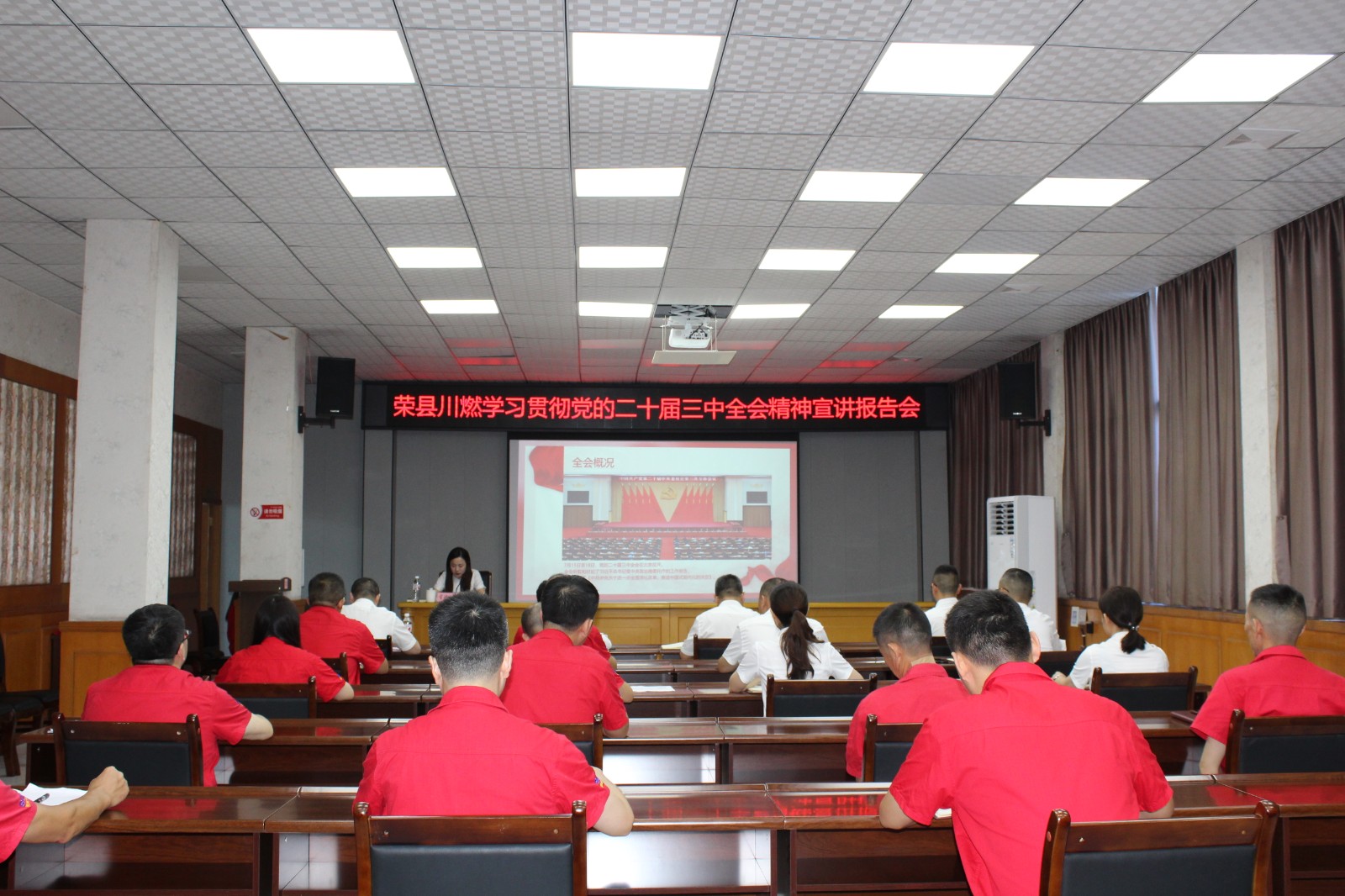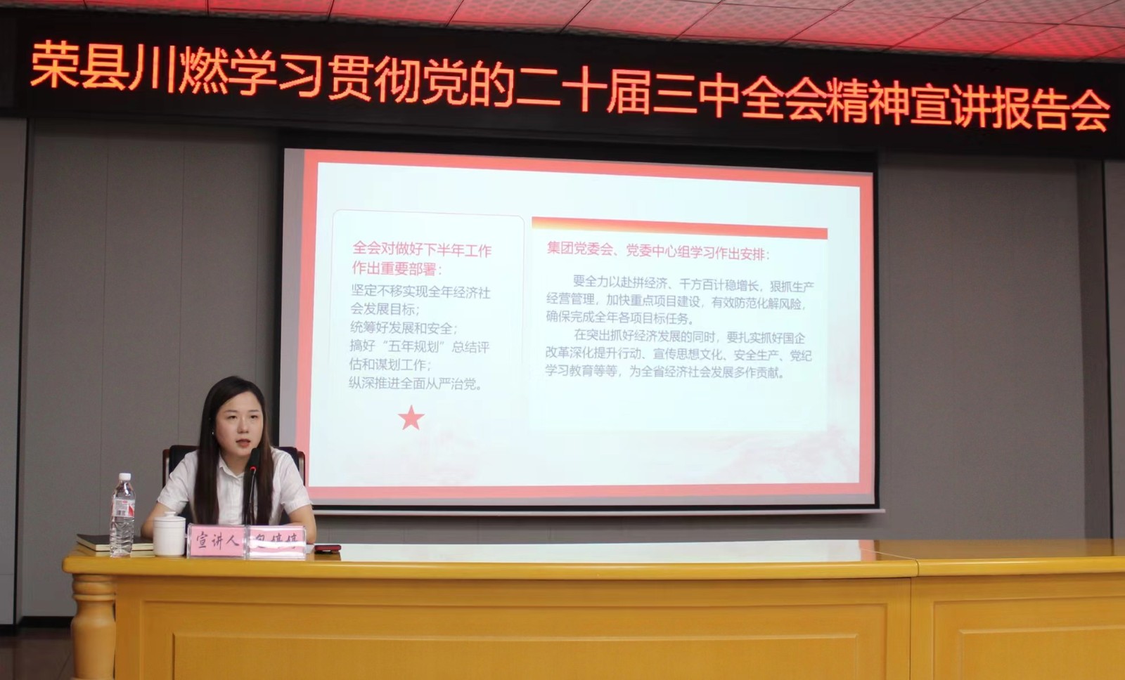 為進(jìn)一步深入學(xué)習(xí)貫徹黨的二十屆三中全會精神,推動全會精神在榮縣川燃落地生根。9月19日上午,川投燃電黨委副書記、職工董事、工會主席包婷婷赴榮縣川燃宣講黨的二十屆三中全會精神。