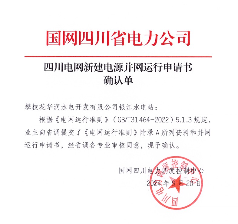 9月20日,在國(guó)網(wǎng)四川省電力公司和川投能源的指導(dǎo)幫助下,經(jīng)過(guò)積極對(duì)接、多方協(xié)調(diào),川投能源下屬攀水電公司成功取得銀江水電站新建電源并網(wǎng)運(yùn)行申請(qǐng)書(shū)確認(rèn)單,標(biāo)志著銀江水電站具備并網(wǎng)手續(xù)辦理的資格條件。