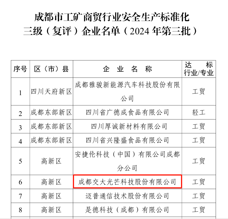 2024年9,成都市應(yīng)急局發(fā)布《關(guān)于公布成都市工礦商貿(mào)行業(yè)安全生產(chǎn)標(biāo)準(zhǔn)化三級(jí)復(fù)評(píng))企業(yè)名單(2024年第三批)的通知》,川投能源所屬交大光芒通過安全生產(chǎn)標(biāo)準(zhǔn)化三級(jí)達(dá)標(biāo)復(fù)評(píng)。