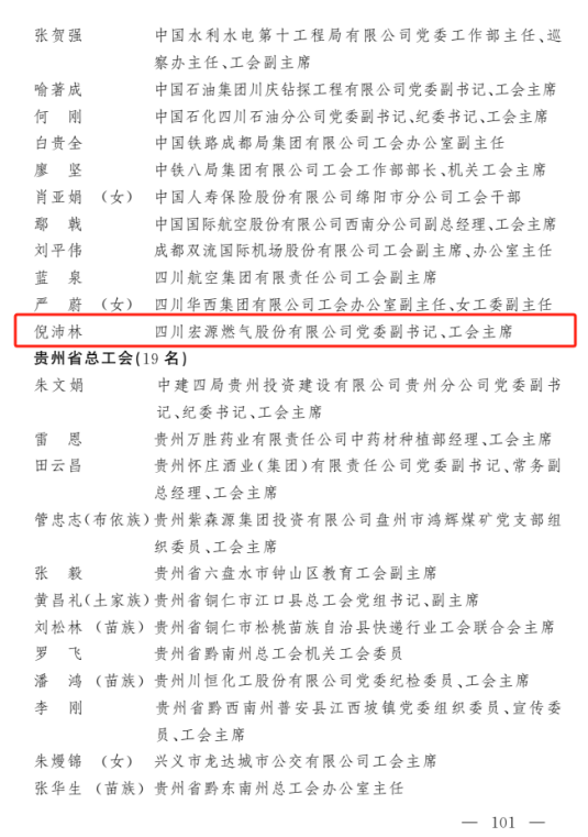 近日,中華全國(guó)總工會(huì)印發(fā)《關(guān)于表彰全國(guó)模范職工之家 全國(guó)模范職工小家 全國(guó)優(yōu)秀工會(huì)工作者的決定》。四川川投燃?xì)獍l(fā)電集團(tuán)有限責(zé)任公司(以下簡(jiǎn)稱川投燃電)所屬四川宏源燃?xì)夤煞萦邢薰荆ㄒ韵潞?jiǎn)稱宏源氣司)黨委副書記、職工董事、工會(huì)主席倪沛林獲評(píng)全國(guó)優(yōu)秀工會(huì)工作者。