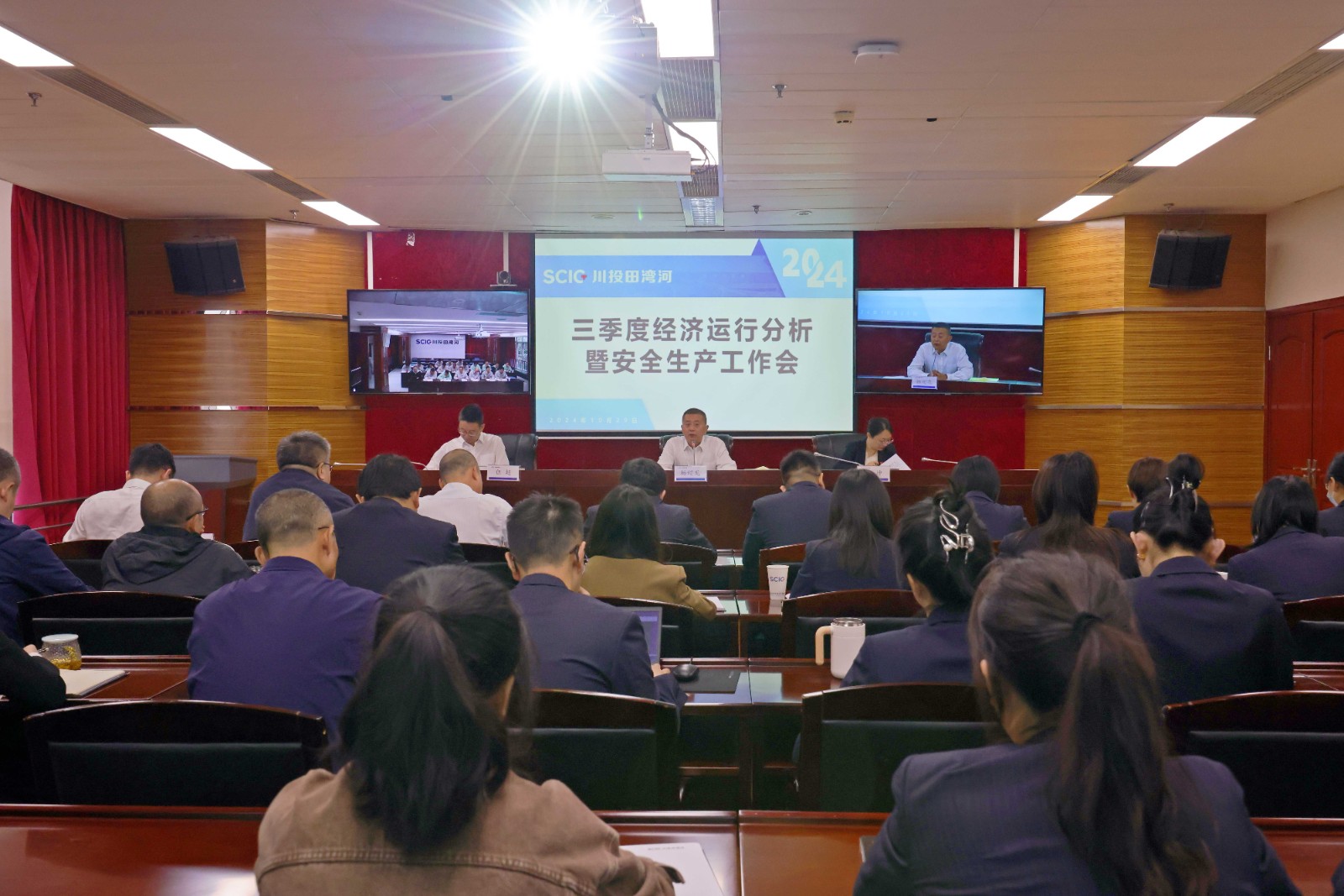10月29日,田灣河公司在成都遠(yuǎn)控、電站現(xiàn)場(chǎng)同步召開2024年三季度經(jīng)濟(jì)運(yùn)行分析暨安全生產(chǎn)工作會(huì)。公司黨委副書記、總經(jīng)理?xiàng)畛埑鱿瘯?huì)議并講話。會(huì)議由黨委副書記、工會(huì)主席楊坤主持,公司領(lǐng)導(dǎo),非生產(chǎn)值班全體員工參加會(huì)議。