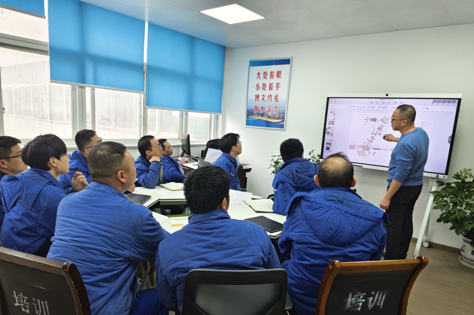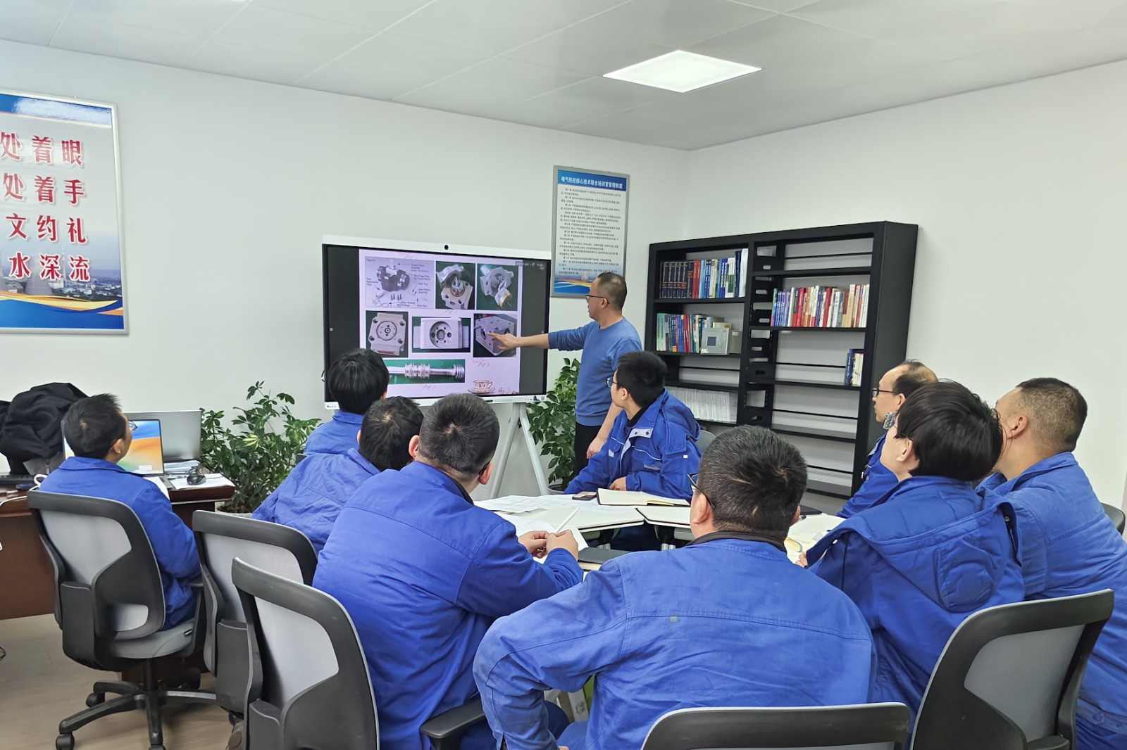 培訓(xùn)中,主講人憑借深厚的專業(yè)知識(shí)與豐富的實(shí)踐經(jīng)驗(yàn),深入剖析了汽輪機(jī)調(diào)速系統(tǒng)的工作原理、保護(hù)、試驗(yàn)、設(shè)備結(jié)構(gòu)特點(diǎn)等,并結(jié)合實(shí)際案例,詳細(xì)講解了日常維保要求、常見故障的診斷及如何快速定位故障點(diǎn)的方法。借助多媒體設(shè)備,主講人將復(fù)雜的油路原理圖變得一目了然,使得培訓(xùn)內(nèi)容更易理解及接受。培訓(xùn)期間,參加人員積極互動(dòng),達(dá)到預(yù)期的培訓(xùn)效果。