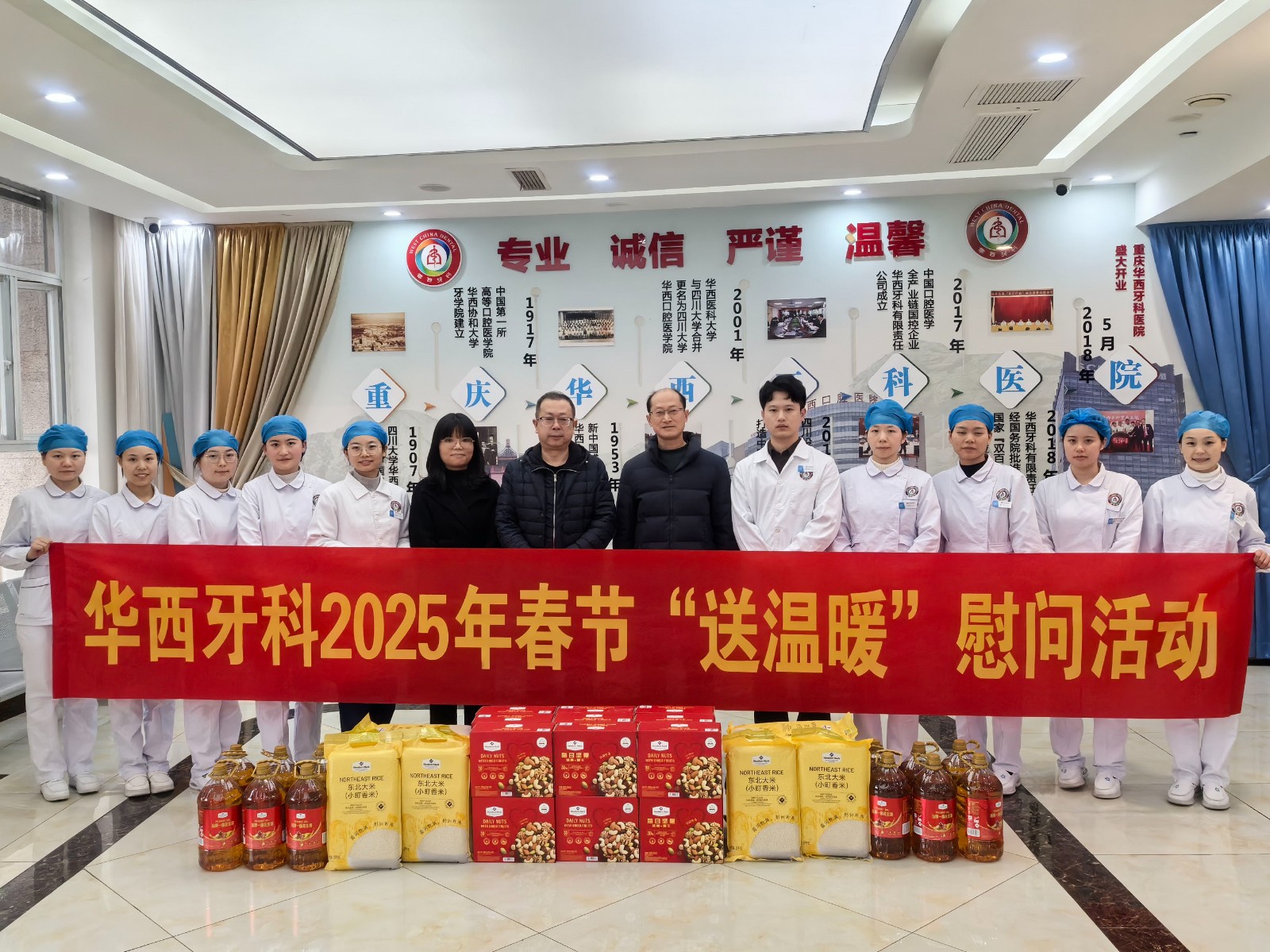 劉凌云首先深入臨床各科室,親切慰問了一線醫(yī)護人員,對大家過去一年的辛勤付出表示衷心感謝,并為大家送上了食用油、大米等慰問物資,代表華西牙科黨委向一線工作人員送上節(jié)日問候與祝福。